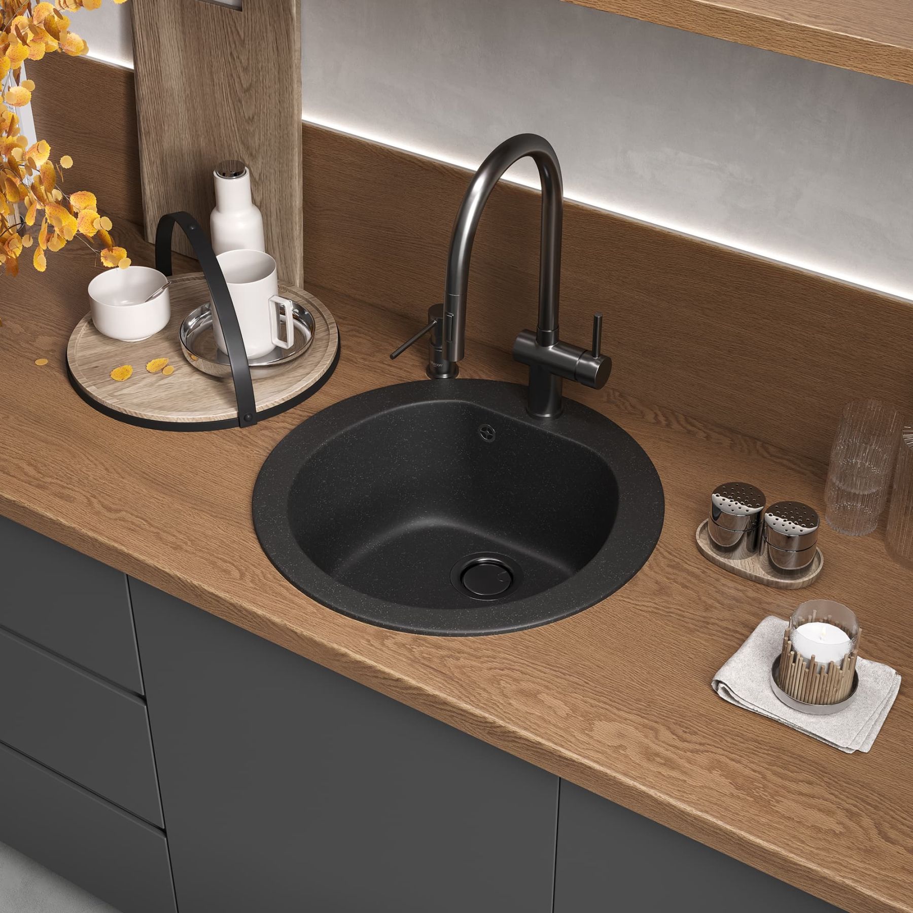 Удобная вместительная мойка подходит для установки как в угловой шкаф кухни, так и в прямые модули.