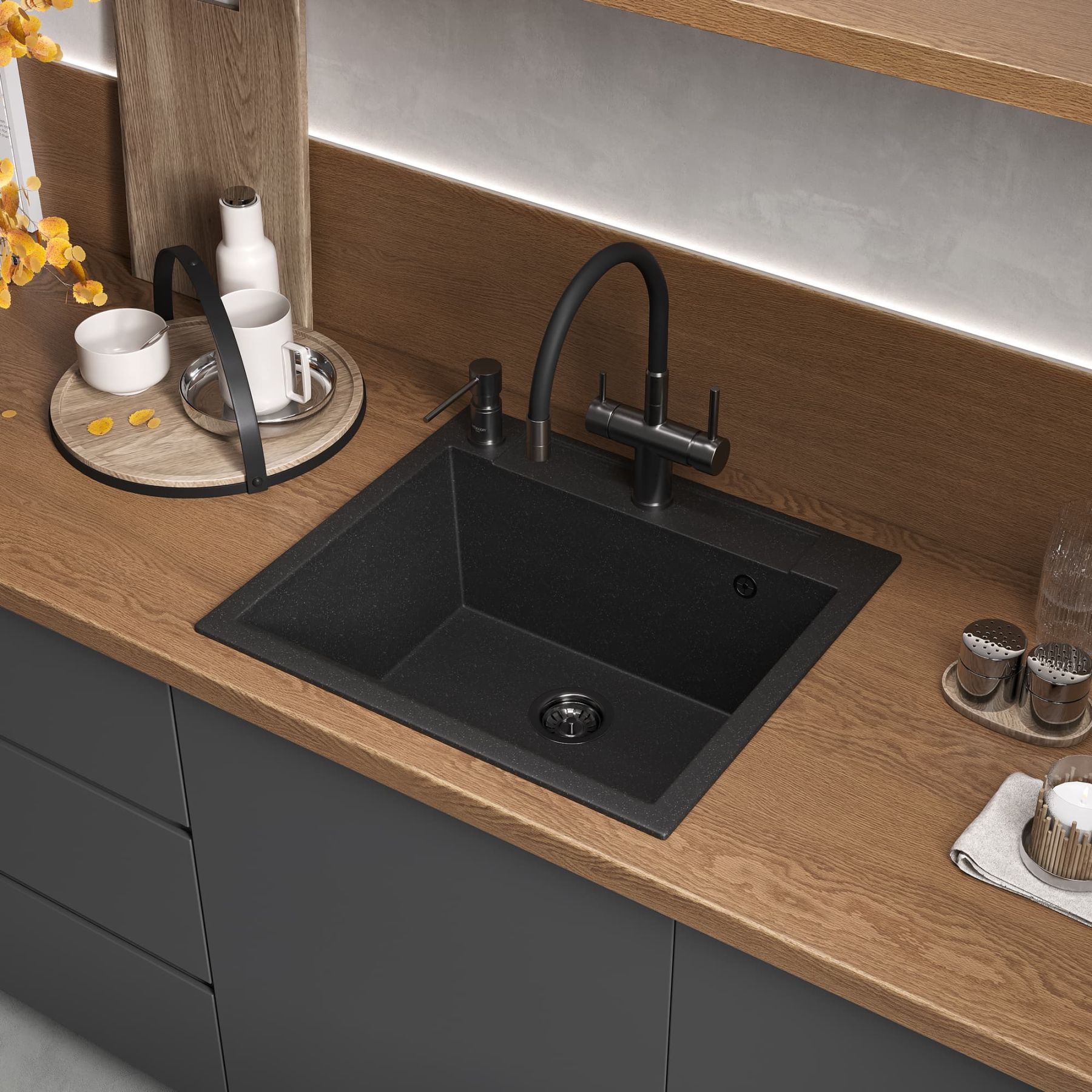 Удобная вместительная мойка подходит для установки как в угловой шкаф кухни, так и в прямые модули.