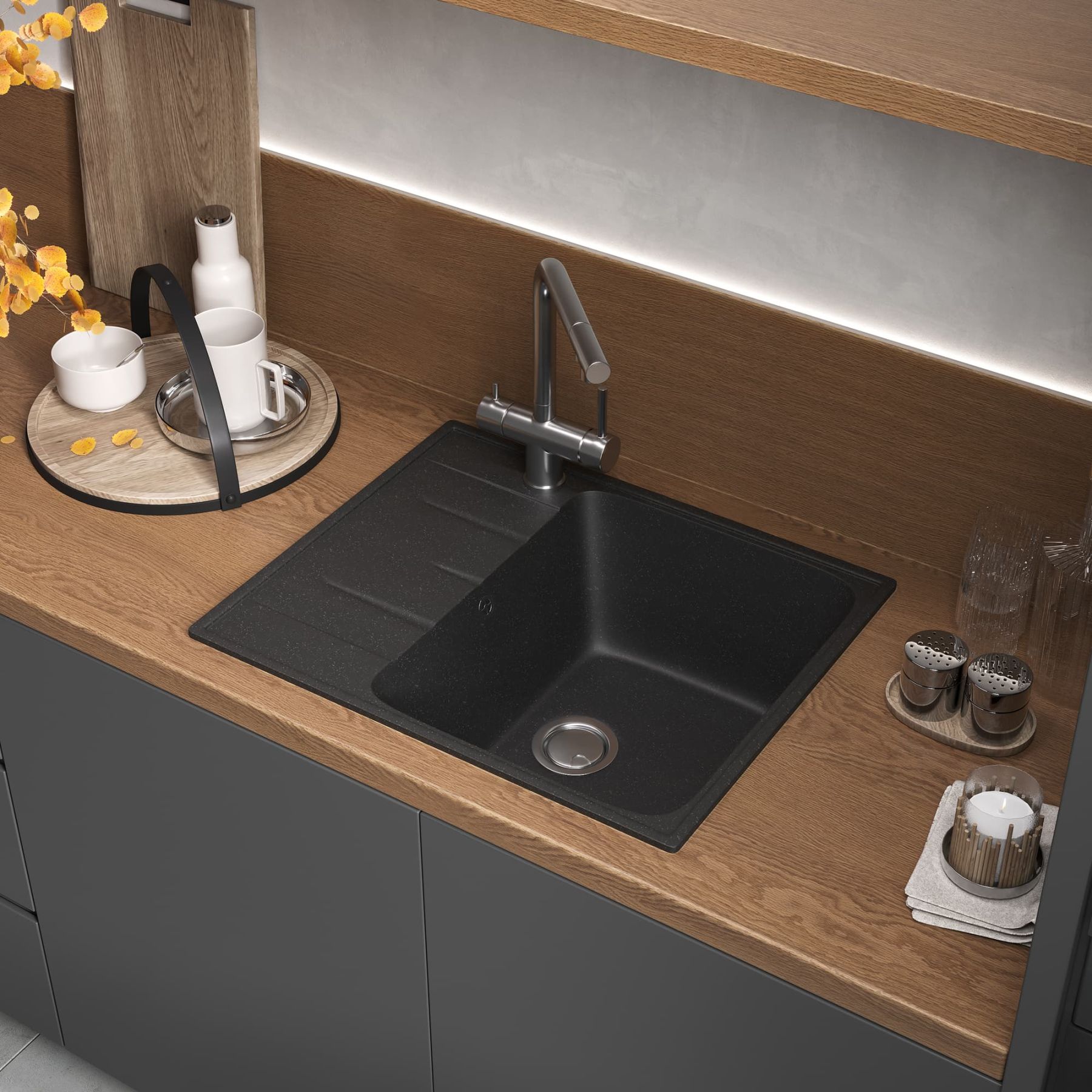 Удобная вместительная мойка подходит для установки как в угловой шкаф кухни, так и в прямые модули.