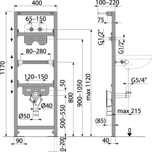 - Интервал крепления умывальника 80-280 мм