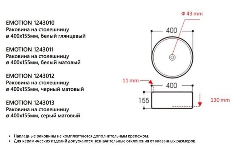 Накладная раковина Avimano Emotion 1243011 40см белый матовый купить