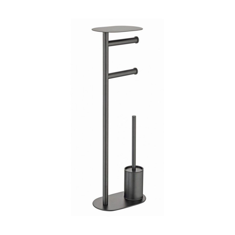 R300.31.09 Многофункциональная стойка для ванной комнаты: ершик, полочка, держатель для туалетной бумаги. Изготовлена из нержавеющей стали. Форма округлая, цвет - "графит". В комплекте 2 сменные щетки - силиконовая и щетинная.
