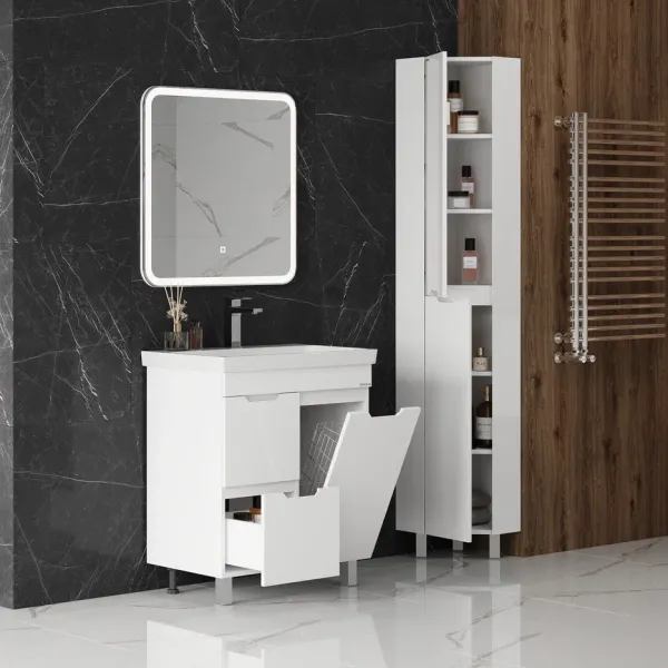 В левой части тумбы расположено пространство за дверцей с доводчиком, под ним ящик с направляющими полного выдвижения, в правой части - откидная дверь с корзиной для белья. Ручки, изящно интегрированные в фасады, позволяют сделать эксплуатацию мебели более удобной и практичной.