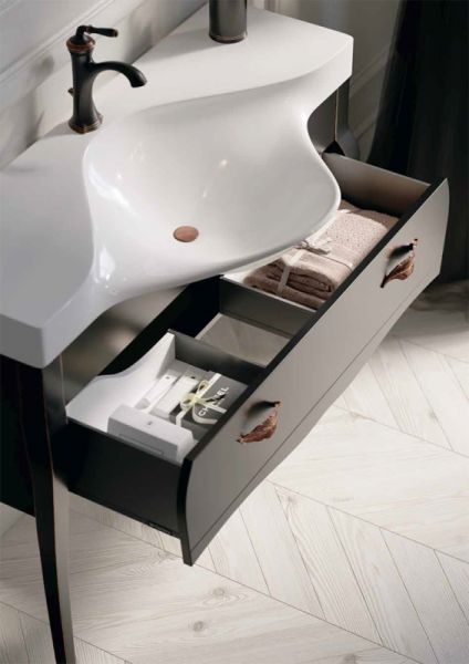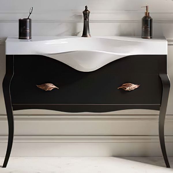 Комбинированная тумба под раковину Clarberg Borgia 115 BOR0111BLK с одним ящиком выполненная в духе современной классики, отличается утонченными и изящными формами, которые подчеркивает патина под медь. Ручки в виде листьев эффектно дополняют образ мебели. Ящик тумбы оборудован системой полного выдвижения LegraBox австрийской фирмы Blum.Технические данные:Цвет: слоновая кость, патина медь.