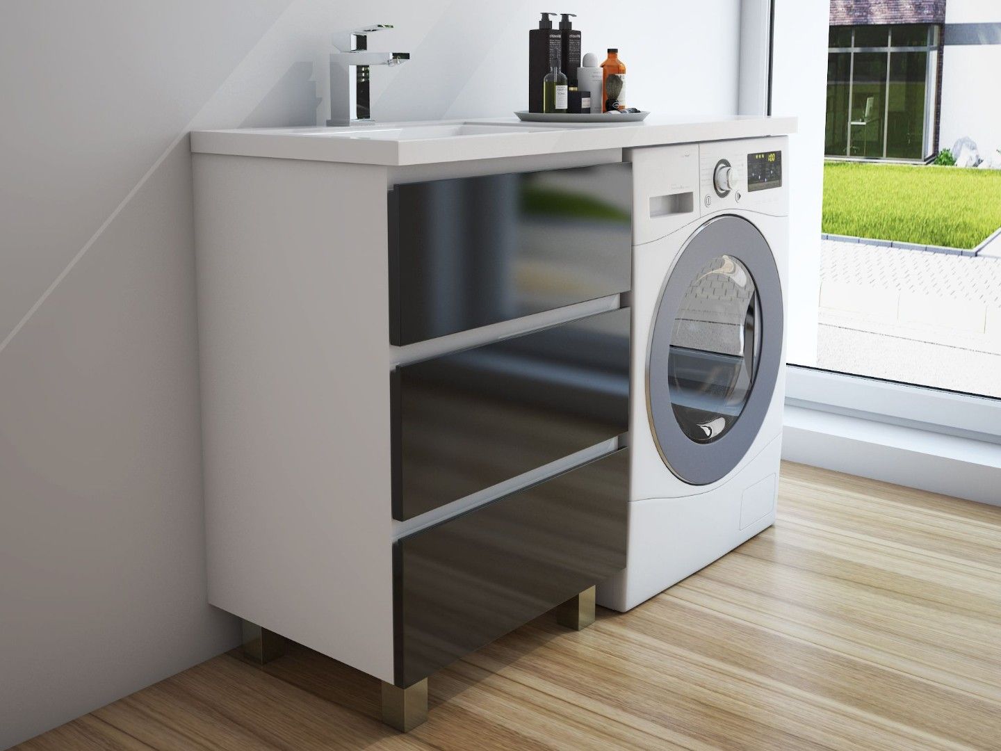 Приоритетом в выборе тумбы с раковиной является площадь ванной комнаты. Функциональная тумба с тремя ящиками решит вопрос для большинства покупателей. Тумба укомплектована раковиной из литьевого мрамора с удобной чашей, стиральная машина устанавливается под столешницей. Три ящика позволят распределить как крупные, так и мелкие вещи.