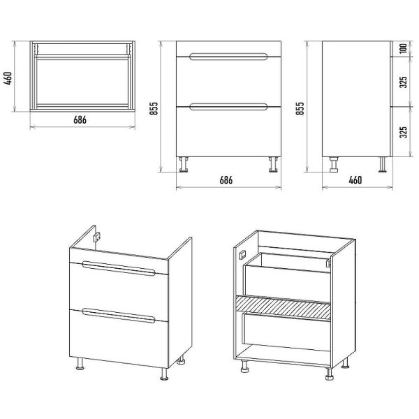 Габариты корпуса тумбы (ШхВхД): 686х855х460 мм.