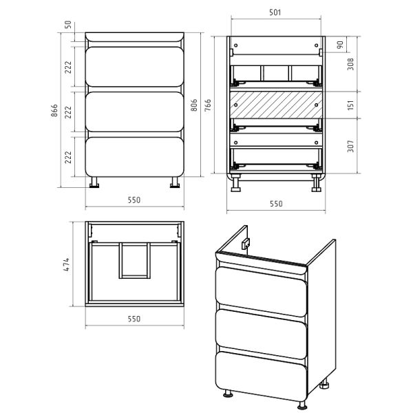 Габариты корпуса тумбы (ШхВхГ): 550х866х474 мм.