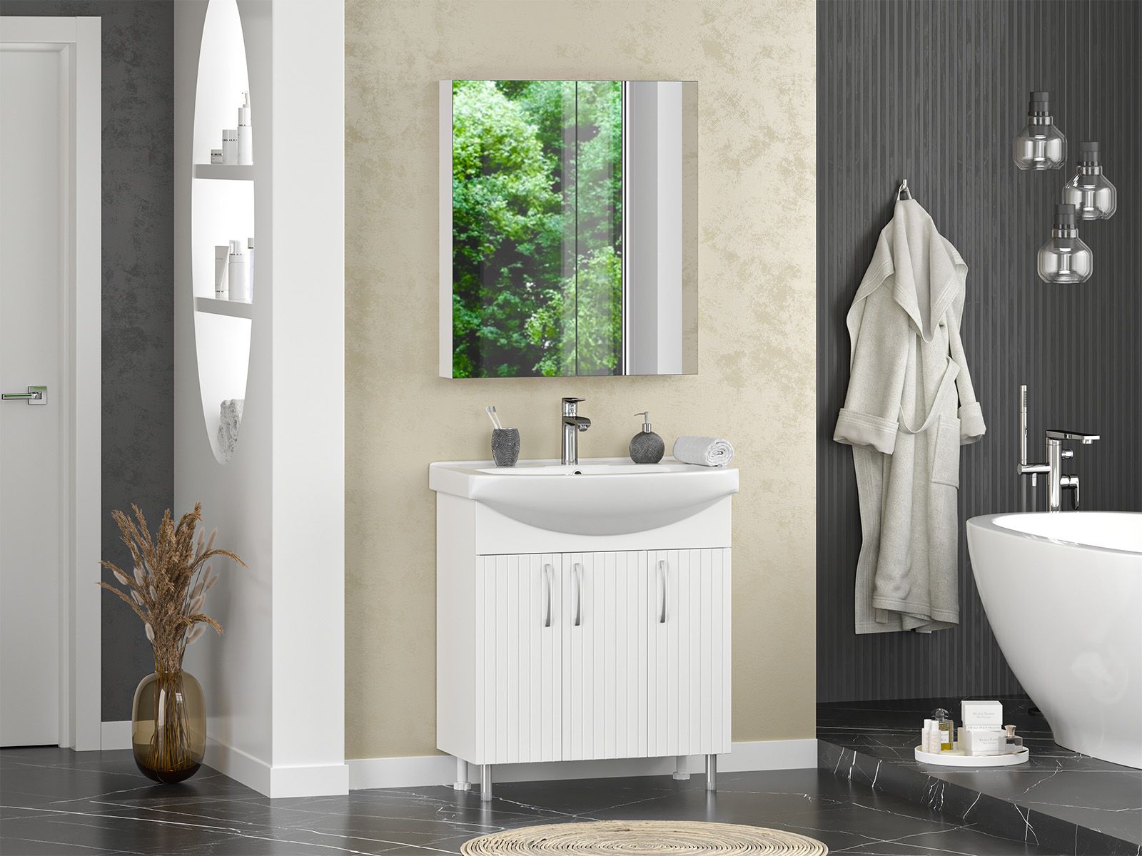 Напольная тумба под раковину – это не просто элемент мебели, но настоящее произведение искусства, которое сочетает в себе функциональность и изысканный дизайн. Изготовленная из высококачественных материалов, она гарантирует долговечность и устойчивость к воздействию влаги.Удобная система хранения позволяет размещать все необходимое для гигиенических процедур, а её продуманные размеры отлично вписываются даже в небольшие помещения. Стильные ручки и элегантные фасады придают тумбе особый шарм, а разнообразие цветовых решений позволит выбрать модель, соответствующую любому интерьеру – от классического до модерн.Мягкие линии и непринужденные формы делают тумбу неотъемлемой частью ванной, превращая её в любимое место для отдыха. Совершенное сочетание эстетики и практичности позволяет создать гармоничный и стильный интерьер, что делает напольную тумбу для ванной комнаты идеальным аксессуаром для любого дома.