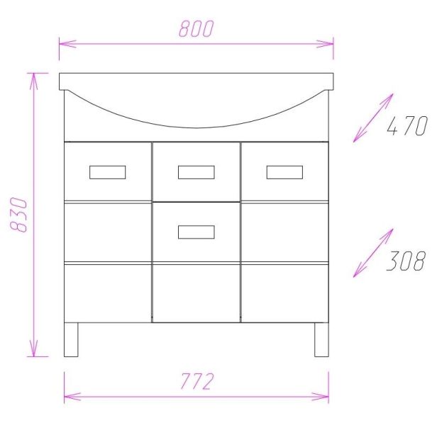 Размеры тумбы без учета раковины и ножек: 77x31x68 см.