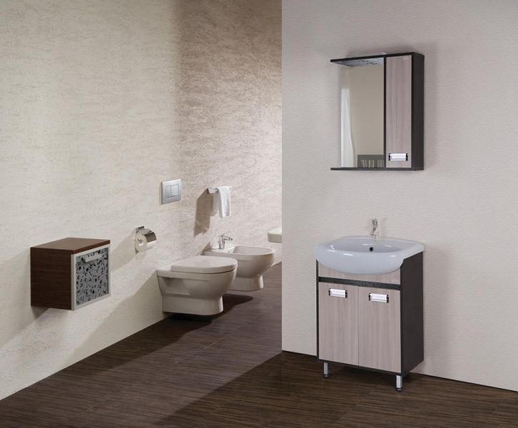 Цвет натурального дерева в 2-х оттенках с крупным фактурным рисунком внесет в интерьер ванной комнаты ощущение комфорта и тепла.