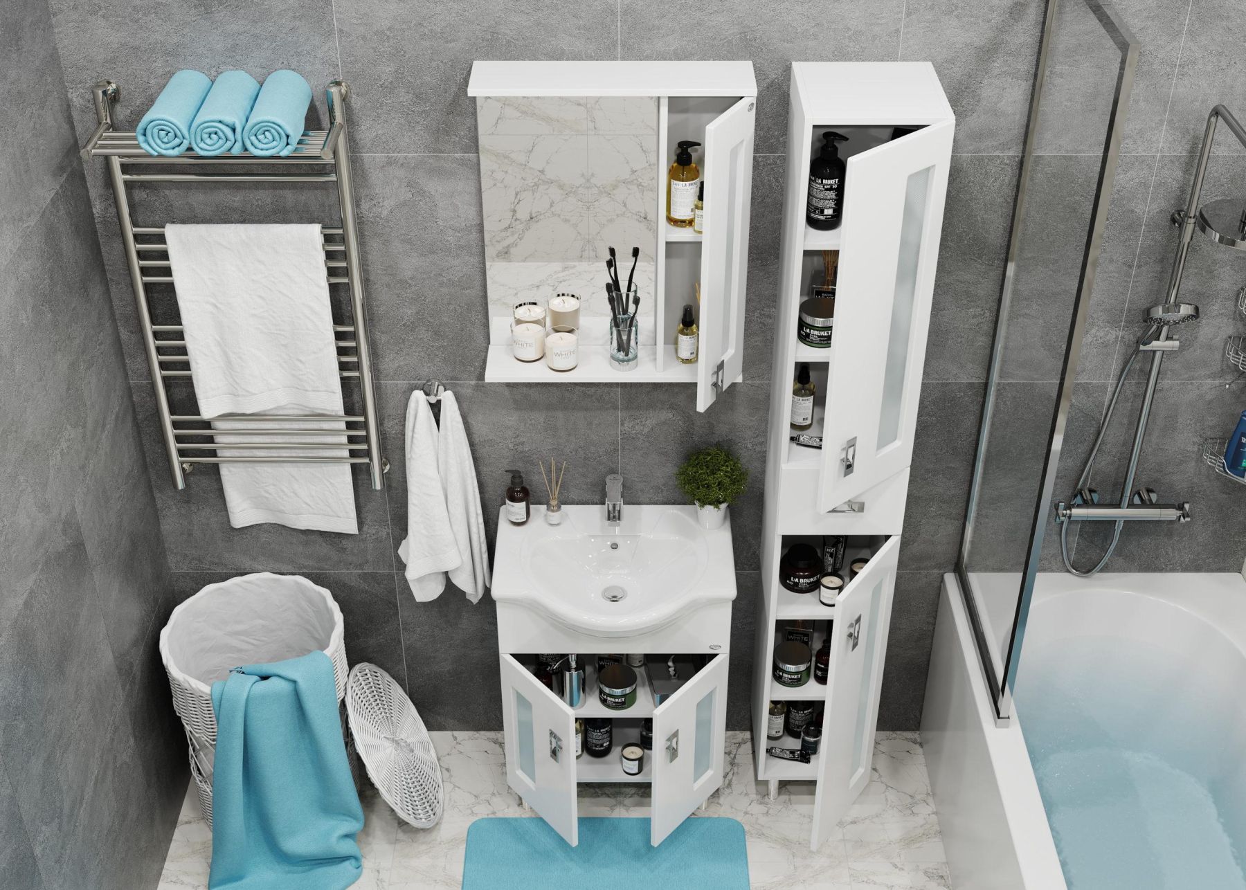Белоснежный глянцевый цвет фасада в сочетании со вставками из матового стекла и хромированными ручками необычной формы придадут ванной комнате ощущение свежести, чистоты и уюта.