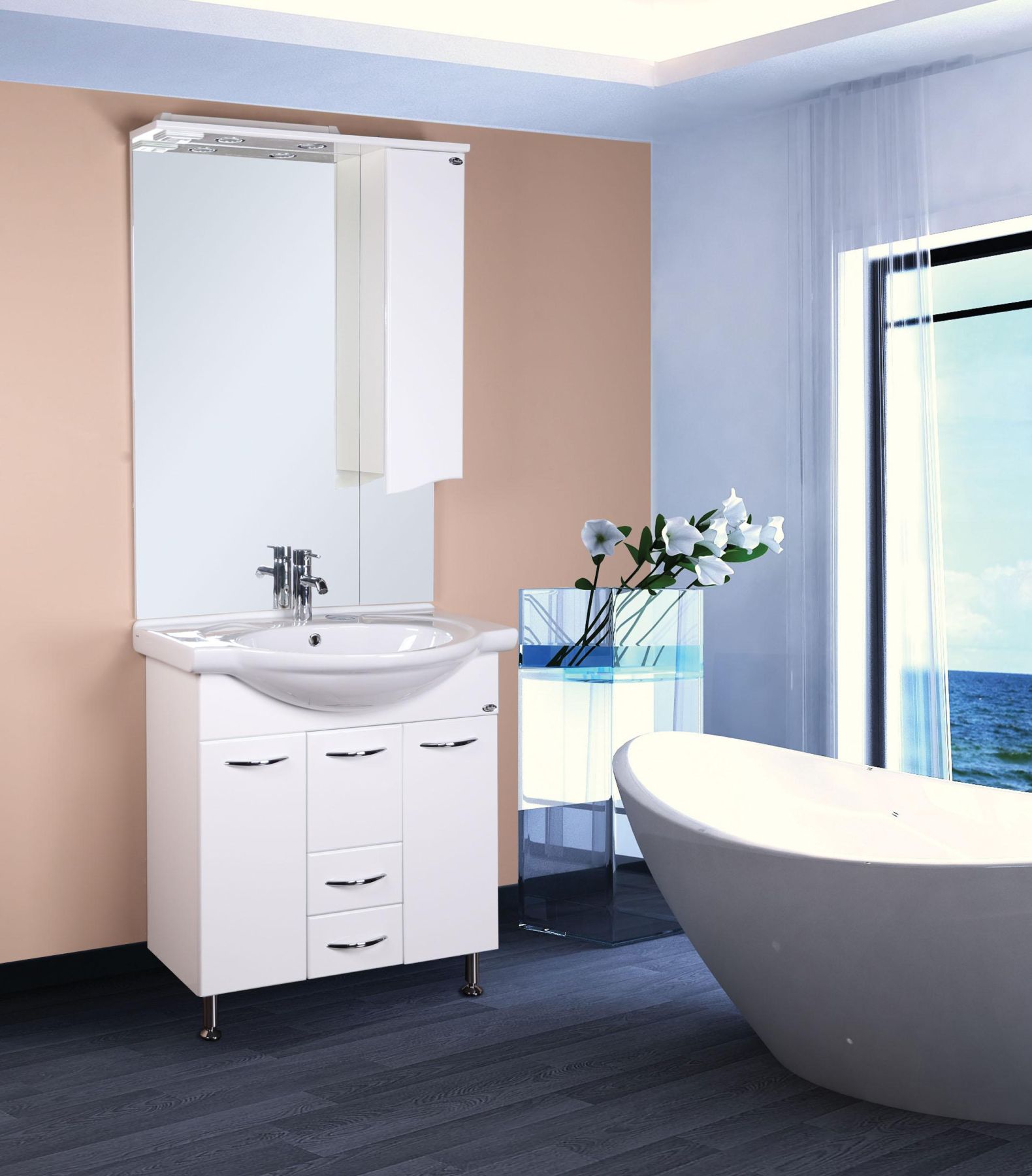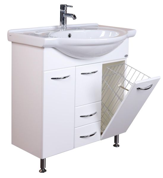 Внутреннее пространство тумбы позволяет компактно разместить бытовые принадлежности: большой отсек за распашной дверцей слева, откидная дверца с бельевой корзиной справа, два выдвижных ящика посередине. Маленькая откидная дверца по центру тумбы обеспечивает доступ к коммуникациям.