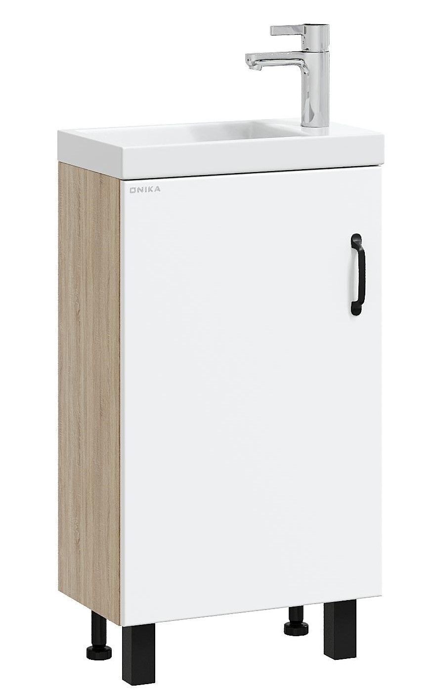 В тумбе Onika Тимбер 45 удачно сочетаются контрастные цвета и фактуры: белый матовый фасад с покрытием SoftTouch, корпус цвета дуба с роскошной текстурой, черная матовая металлическая фурнитура.