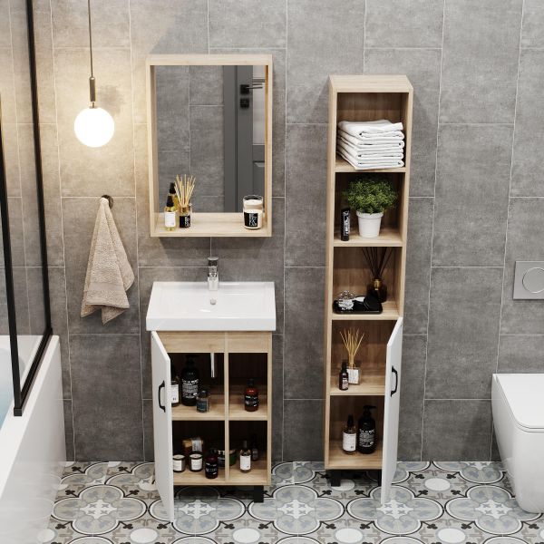 В тумбе Onika Тимбер 50 удачно сочетаются контрастные цвета и фактуры: белый матовый фасад с покрытием SoftTouch, корпус цвета дуба с роскошной текстурой, черная матовая металлическая фурнитура.