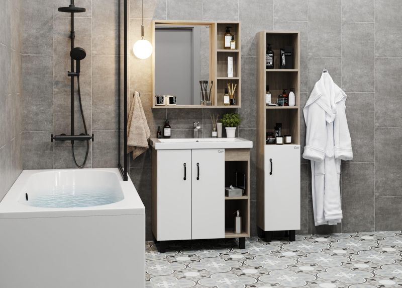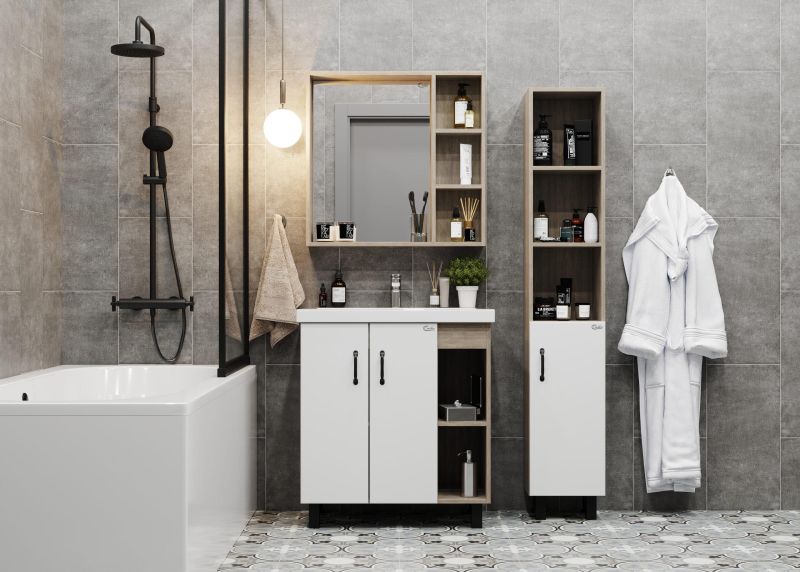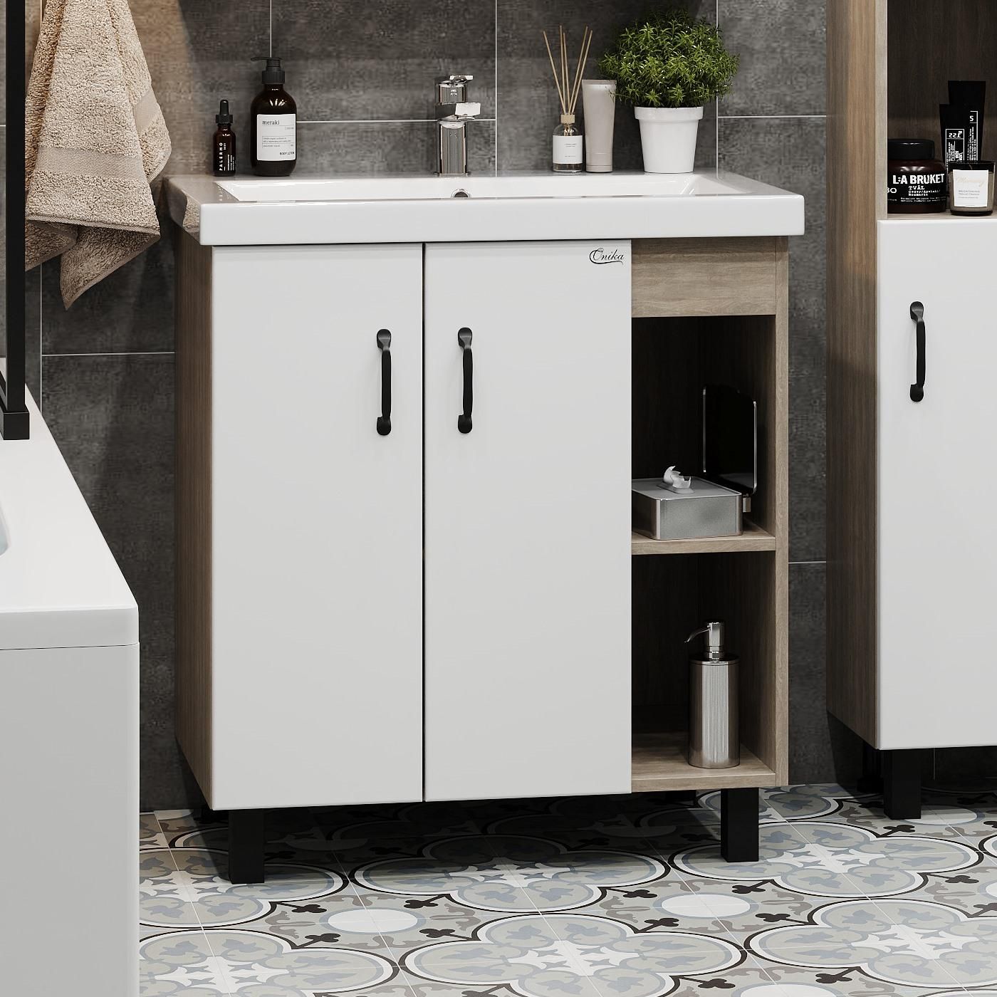 В тумбе Onika Тимбер 70 удачно сочетаются контрастные цвета и фактуры: белый матовый фасад с покрытием SoftTouch, корпус цвета дуба с роскошной текстурой, черная матовая металлическая фурнитура.