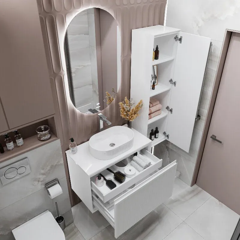 Открытые полки справа обеспечивают быстрый доступ к часто используемым аксессуарам, а пространство за распашными дверцами слева, снабженными системой плавного закрывания, станет удобным местом для хранения различных бытовых принадлежностей.
