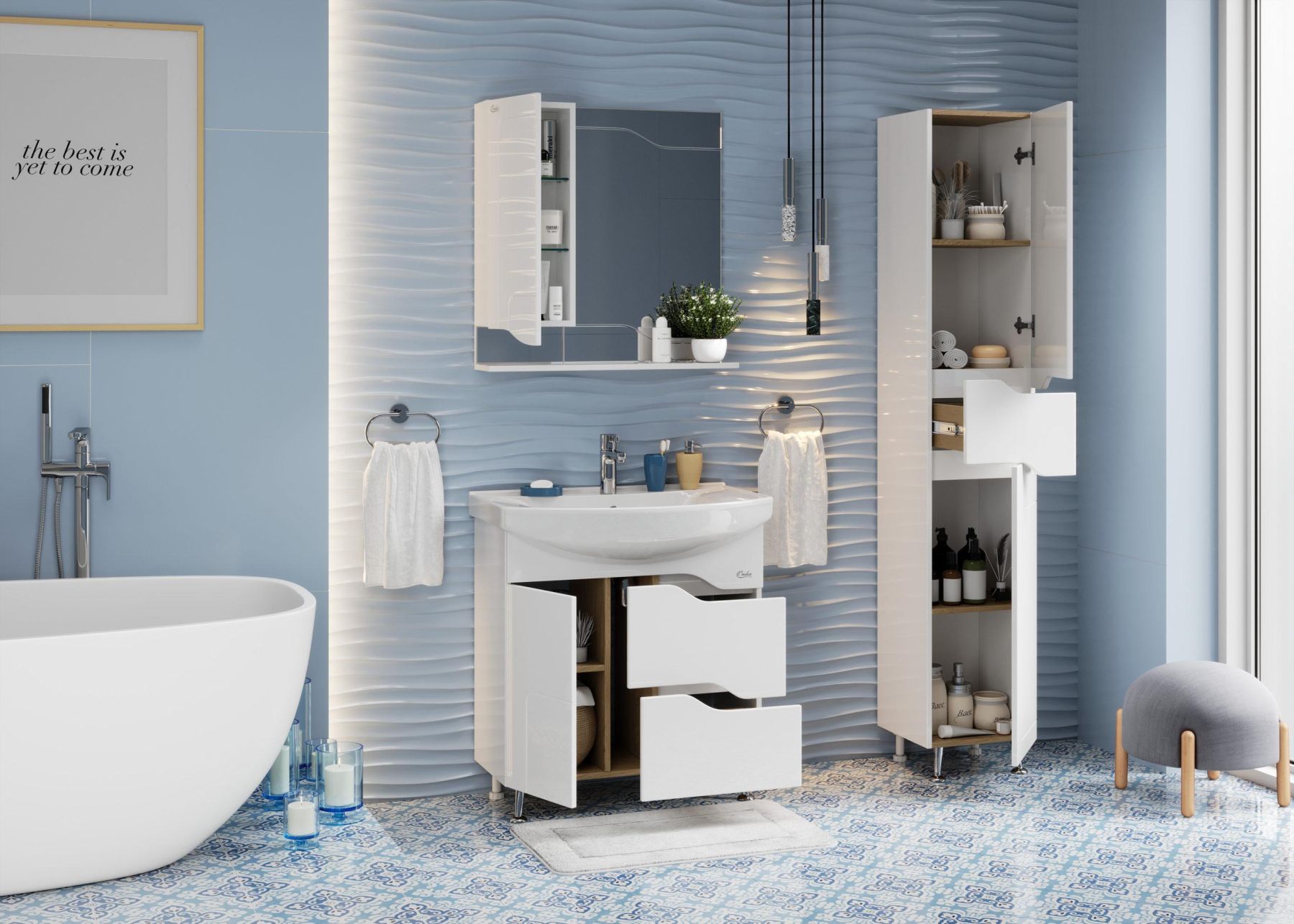Два вместительных ящика, снабженные направляющими полного выдвижения, помогут организовать пространство в ванной комнате и компактно разместить необходимые вещи, а распашная дверь слева, оснащенная системой открывания push-to-open, скрывает дополнительное место для хранения.