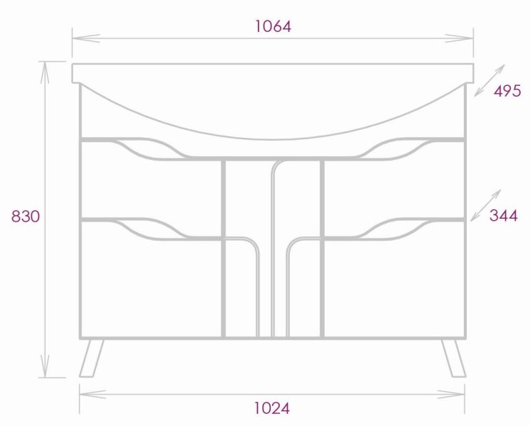 Размеры тумбы без учета раковины и ножек: 102x34x68 см.
