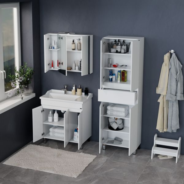 Комплектация: ножка хром - 2 шт., ножка пластик 2 шт., петли с плавным закрыванием - 3 шт. Напольная тумба под раковину Марс 80 с 3 дверками — это стильное и функциональное решение для вашей ванной комнаты. Она изготовлена из качественного ЛДСП, фасады покрыты глянцевой эмалью, что обеспечивает долговечность и устойчивость к влаге. Тумба оснащена 3 дверцами с плавным закрыванием на петлях, что обеспечивает комфортное использование и хранение. Размеры тумбы составляют 76,5 см в ширину, 43,5 см в глубину и 80 см в высоту, под нее подходит умывальник Сириус 80. В комплект входят две хромированные и две пластиковые ножки.