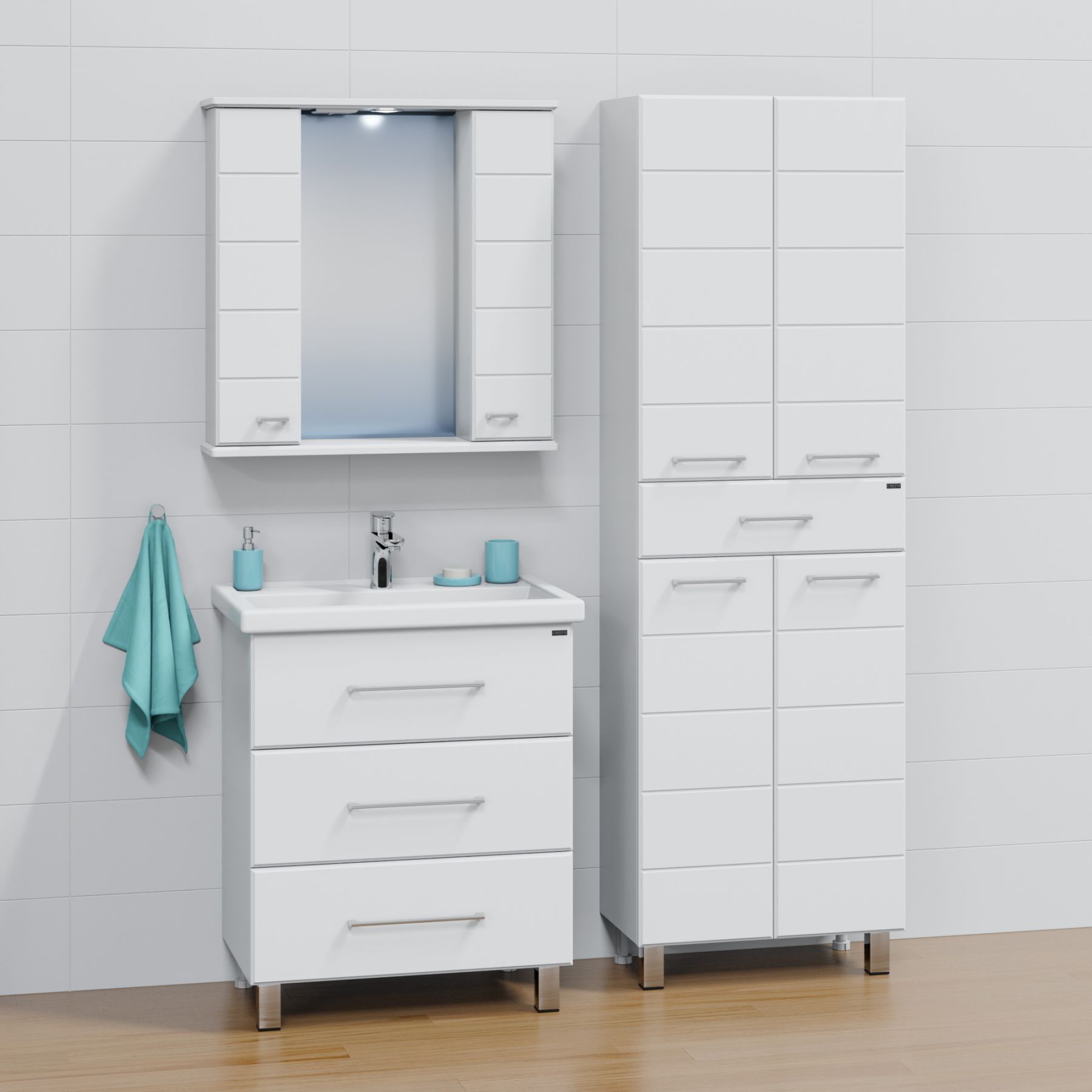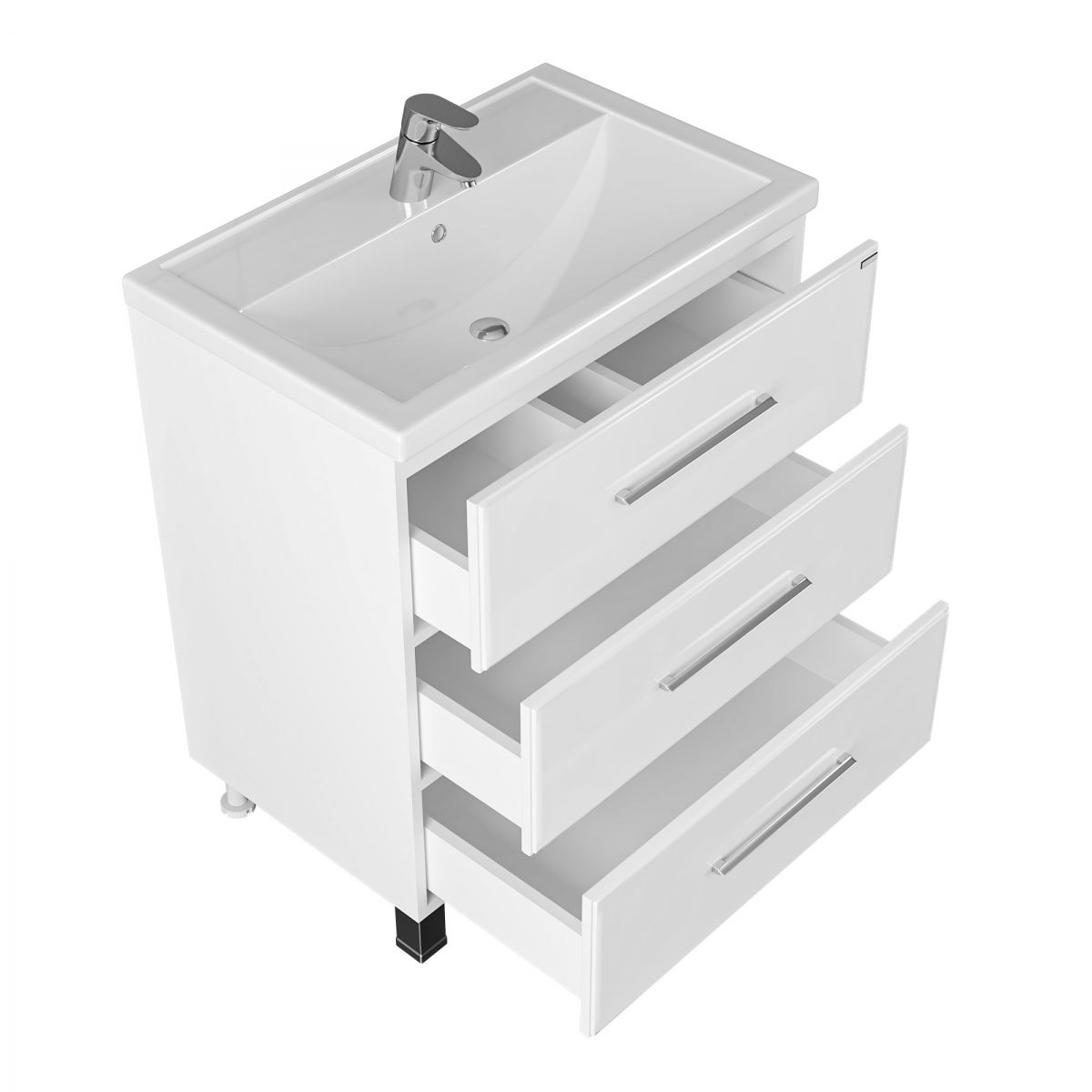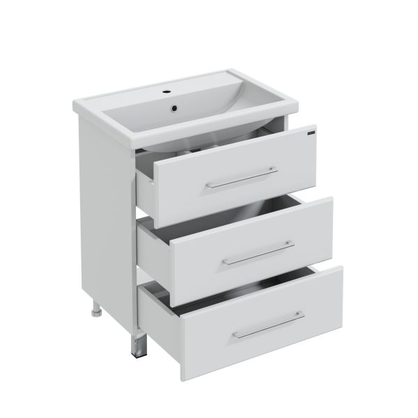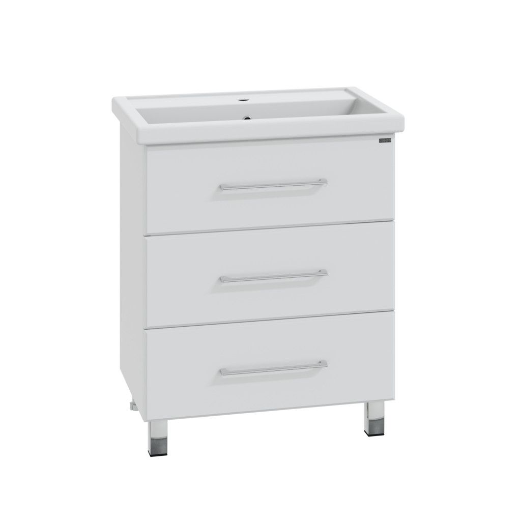 Тумба напольная Омега 70 для умывальника Фостер 70. Корпус изделия выполнен из влагостойкого ЛДСП, фасад из МДФ и покрыт пленкой. Выдвижные ящики тумбы оснащены шариковыми направляющими полного выдвижения.