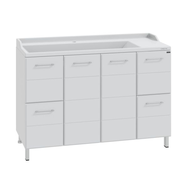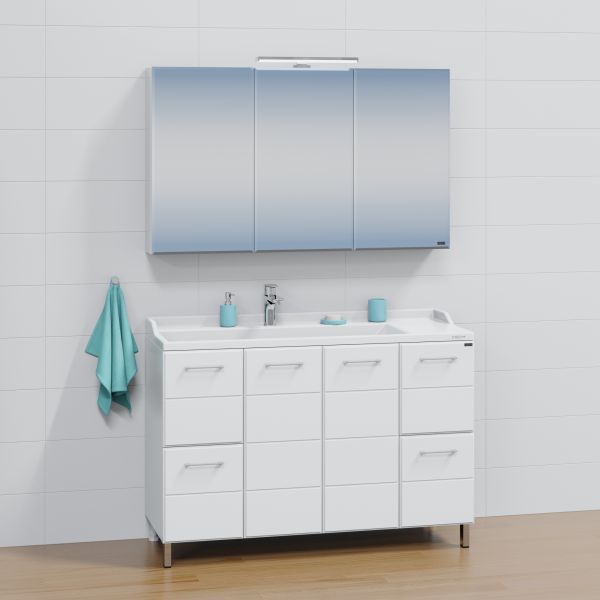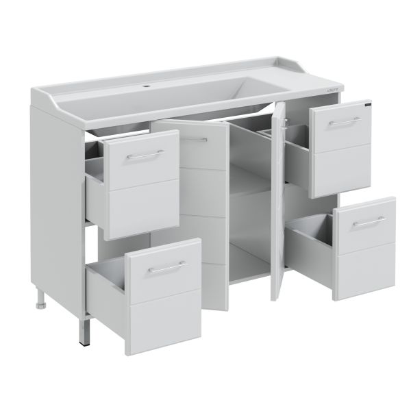 Тумба напольная Омега 120 для умывальника Sirius 120. Корпус изделия и фасад выполнен из МДФ. Фасад и боковины мебели покрыты глянцевой ПВХ плёнкой. У тумбы 4 двери и 2 выдвижных ящика, что обеспечивает лёгкий доступ к её содержимому. Выдвижные ящики тумбы оснащены шариковыми направляющими полного выдвижения. Фасады тумбы выполнены из МДФ с фрезеровкой и покрыты глянцевой ПВХ-пленкой, а боковины — из белого влагостойкого ЛДСП. Хранение за дверцами и ящиками позволяет организовать пространство с максимальной функциональностью. Мебель для ванной комнаты СанТа Омега - современная и стильная мебель. Коллекция представлена в различных размерах, что позволяет подобрать оптимальный вариант для ванной комнаты любого размера. Помимо тумб под умывальники, в коллекции представлены пеналы, зеркала и шкафчики, которые помогут создать гармоничный и удобный для вас комплект. Комплектация: Ручка хром - 6, ножка хром - 2, ножка пластик - 2, выдвижной ящик с шариковыми направляющими – 4 шт.