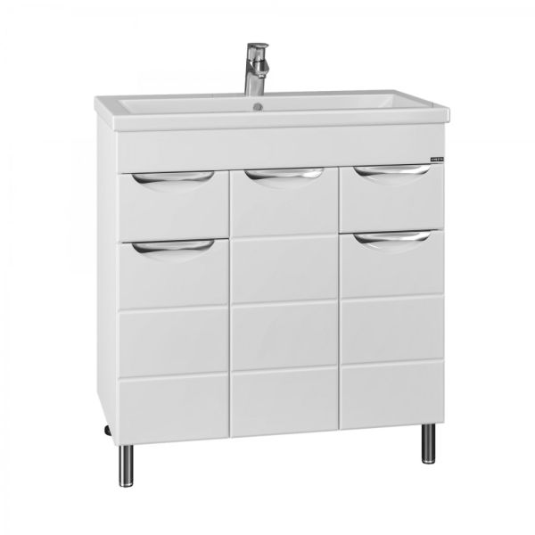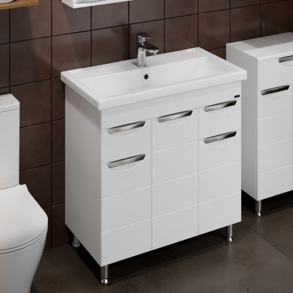Тумба под раковину Санта Родос 80 под умывальник Фостер 80 — это воплощение современного и стильного дизайна, созданное специально для вашей ванной комнаты. Она оборудована тремя дверцами и двумя ящиками, что обеспечивает лёгкий доступ к её содержимому. Фасады тумбы выполнены из МДФ с фрезеровкой и покрыты глянцевой ПВХ-пленкой, а боковины — из белого влагостойкого ЛДСП. Хренение за дверцами и ящиками позволяет организовать пространство с максимальной функциональностью.