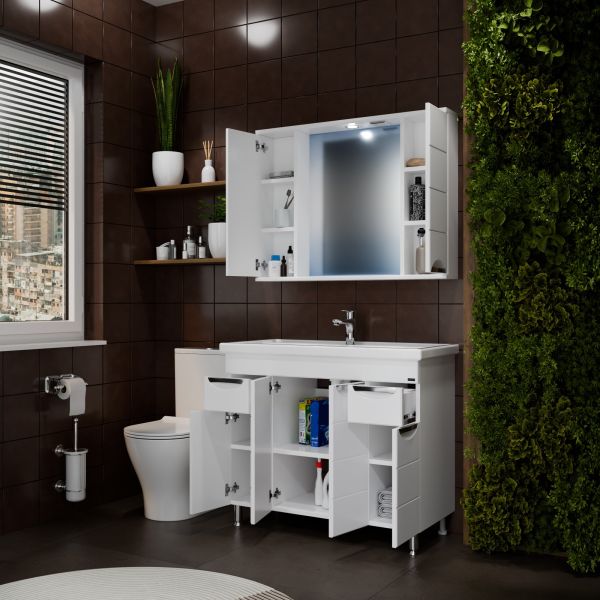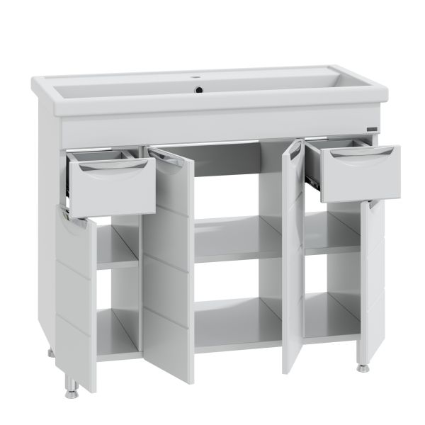 Тумба под раковину Санта Родос 100 под умывальник Фостер 100 — это воплощение современного и стильного дизайна, созданное специально для вашей ванной комнаты. Она оборудована четыремя дверцами и двумя ящиками, что обеспечивает лёгкий доступ к её содержимому. Фасады тумбы выполнены из МДФ с фрезеровкой и покрыты глянцевой ПВХ-пленкой, а боковины — из белого влагостойкого ЛДСП. Хренение за дверцами и ящиками позволяет организовать пространство с максимальной функциональностью.