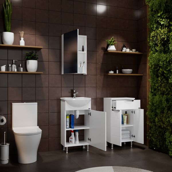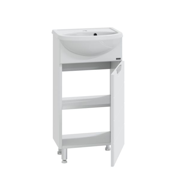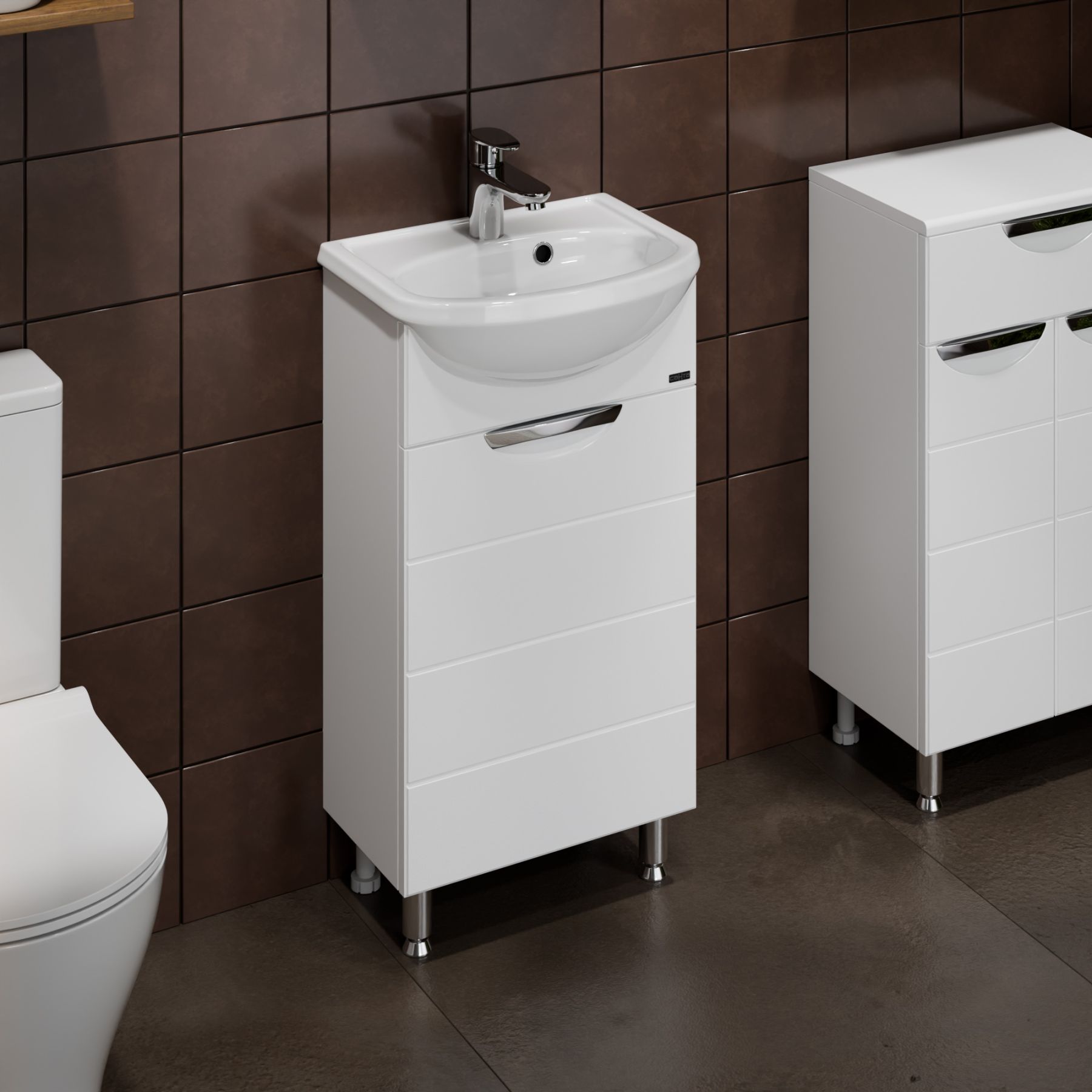 Комплектация: ручка хром - 1 шт., ножка хром - 2 шт., ножка пластик 2 шт., петли с плавным закрыванием - 2 шт. Тумба под раковину Санта Родос 45 под умывальник Уют 45 — это воплощение современного и стильного дизайна, созданное специально для вашей ванной комнаты. Она оборудована дверцей, что обеспечивает лёгкий доступ к её содержимому. Фасад тумбы выполнен из МДФ с фрезеровкой и покрыт глянцевой ПВХ-пленкой, а боковины — из белого влагостойкого ЛДСП. Внутри расположена одна полочка, что позволяет организовать пространство с максимальной функциональностью. Коллекция Родос отличается элегантностью и доступной ценой, что делает эту мебель отличным выбором для создания уютной и функциональной ванной комнаты.