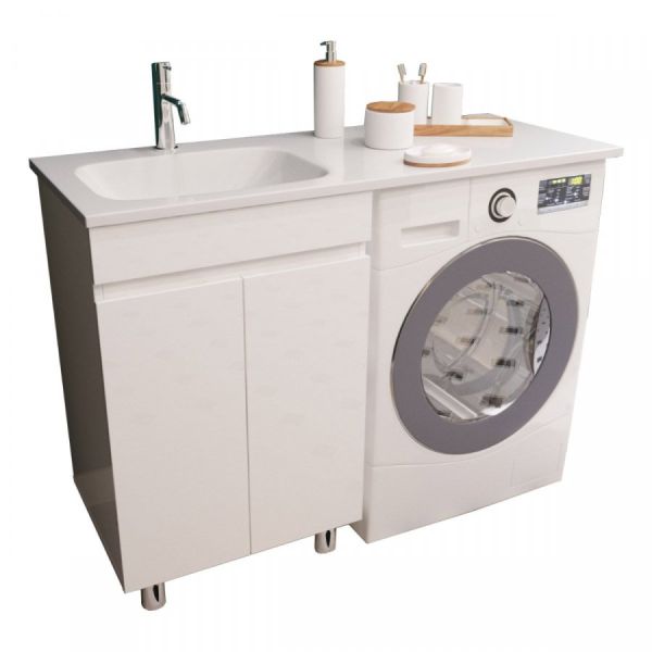 Тумба укомплектована раковиной из литьевого мрамора c глубокой чашей, плавными изгибами и вкладышем для слива. Раковина с большой столешницей удобная и функциональная. В тумбе 2 распашных дверцы со скрытыми ручками и полкой внутри, что делает использование максимально комфортным. Стиральная машина устанавливается под столешницей, за счет чего экономит место в ванной комнате.