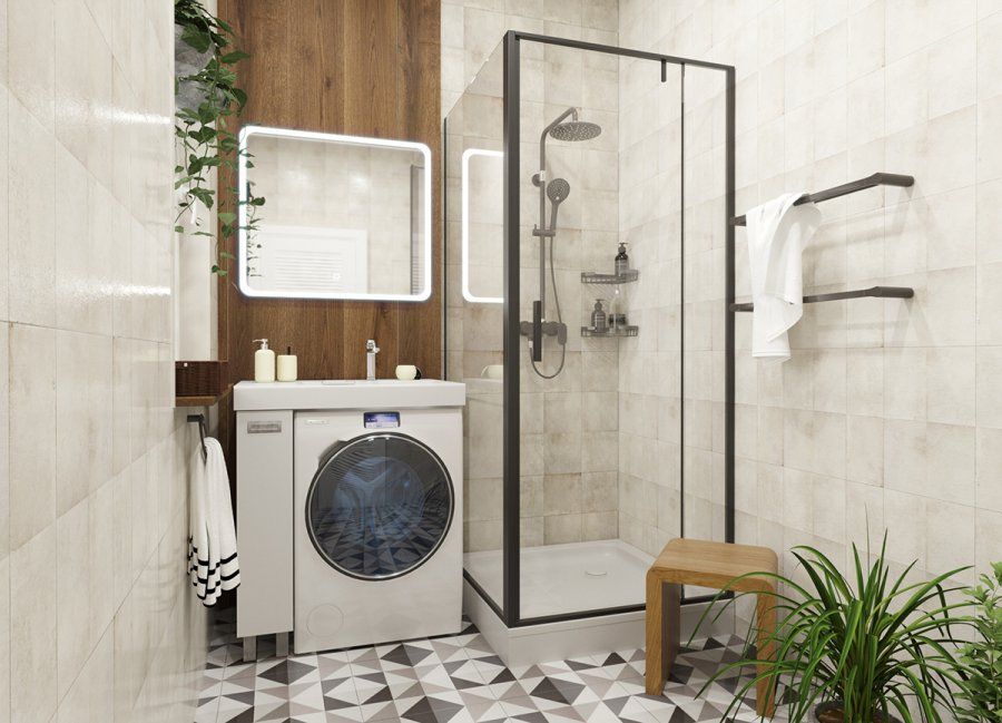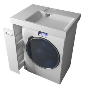 Простые и четкие линии тумбы идеально впишутся в интерьер в стиле «минимализм», а компактная раковина из литьевого мрамора установленная над стиральной машиной, позволяет сэкономить место в ванной комнате.