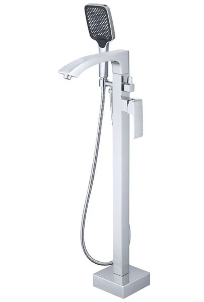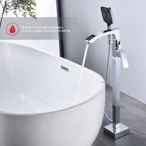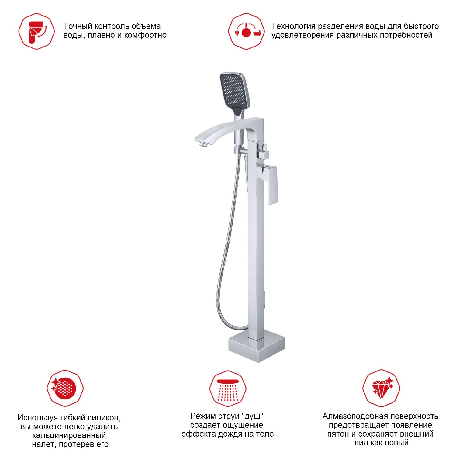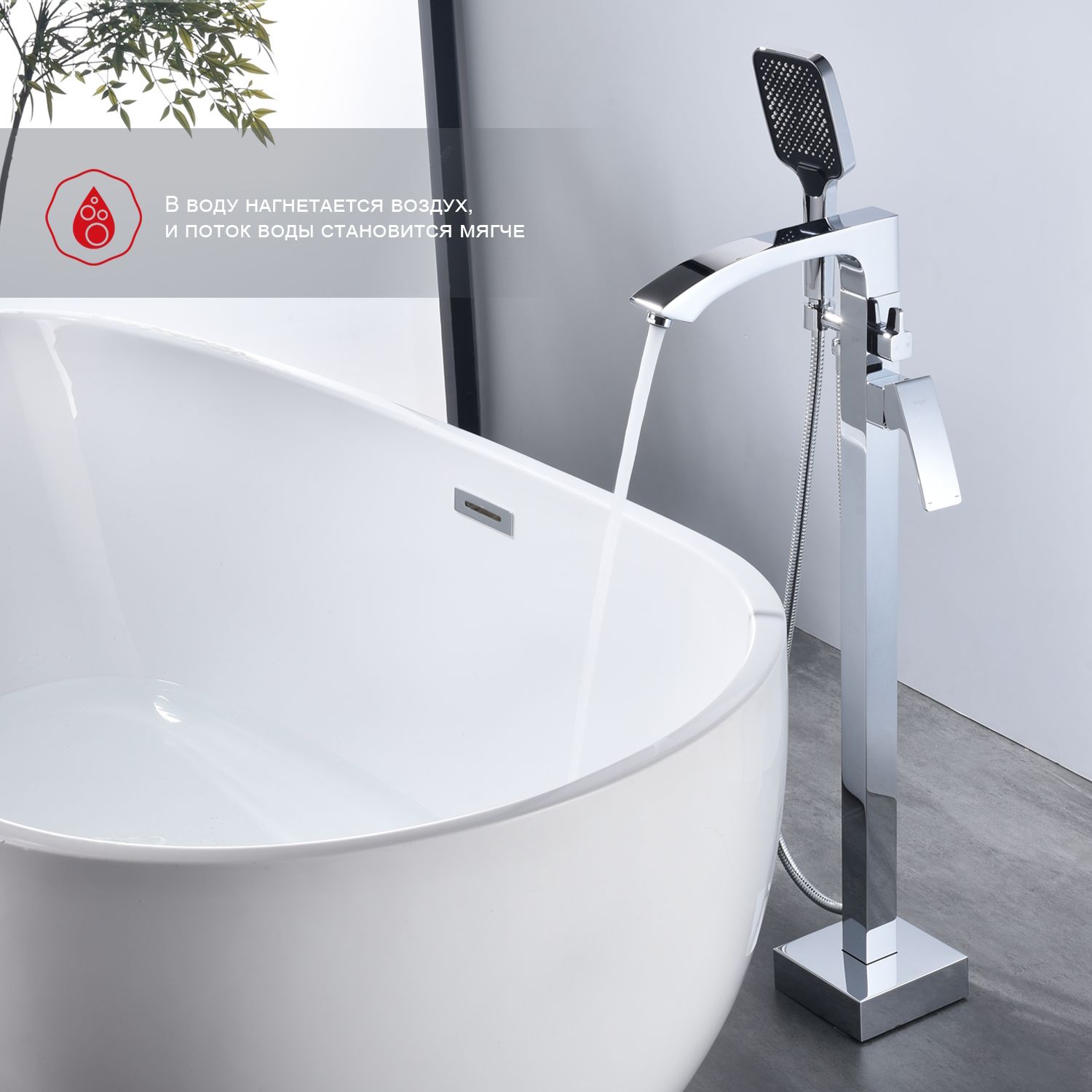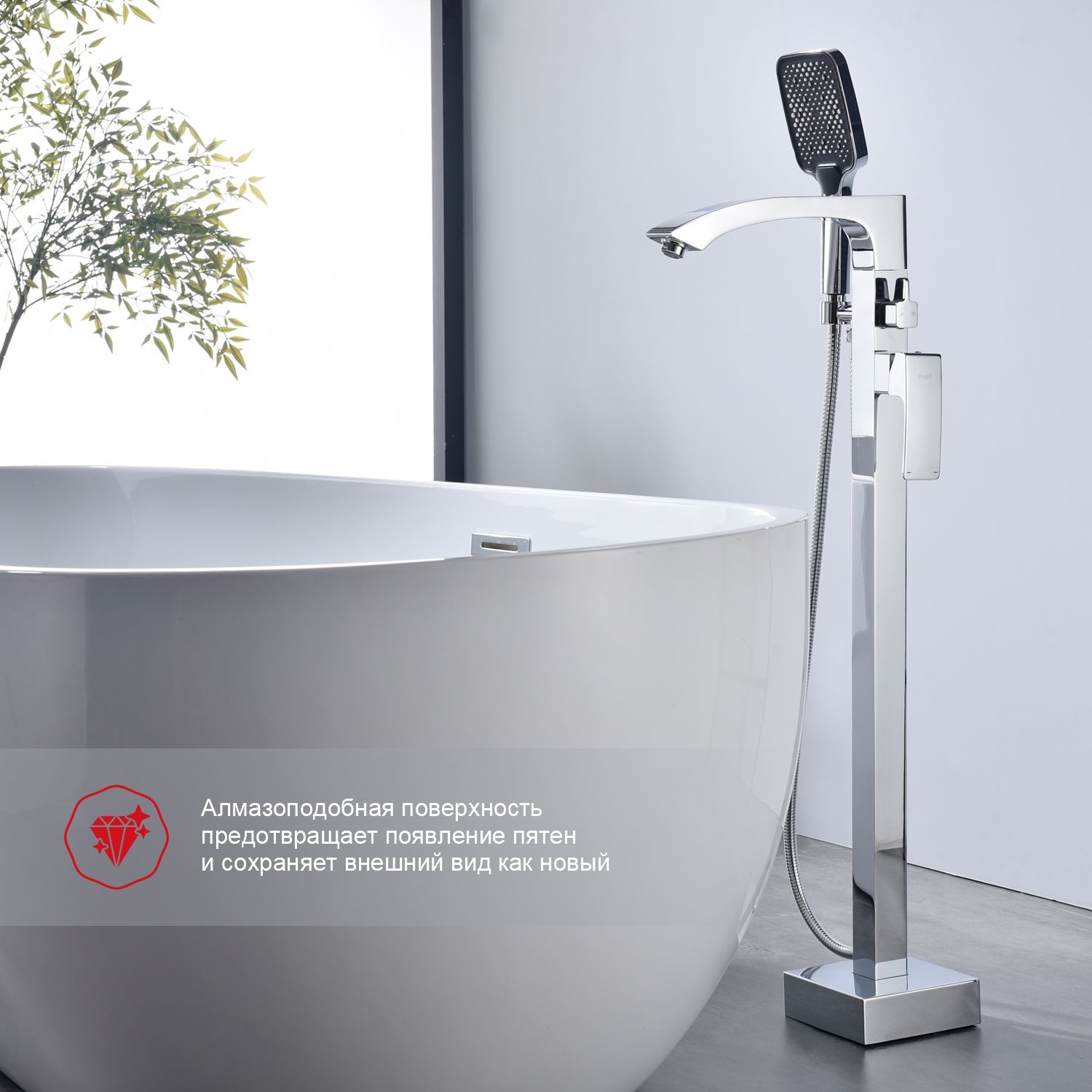 Смеситель для ванны напольный Raglo R01.33, хром. Однорычажный хромированный квадратный смеситель со стационарным средним изливом и высоким формированием струи. Современный стиль. Оснащен функцией экономии воды; аэратор. Изготовлен из прочного и надежного латунного материала.Напольный монтаж. Рычаг расположен сбоку. Переключение на душ осуществляется нажатием. Без системы быстрого монтажа.