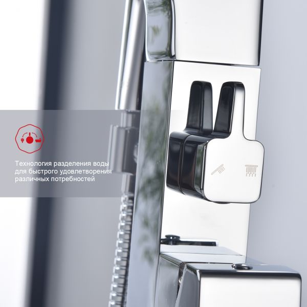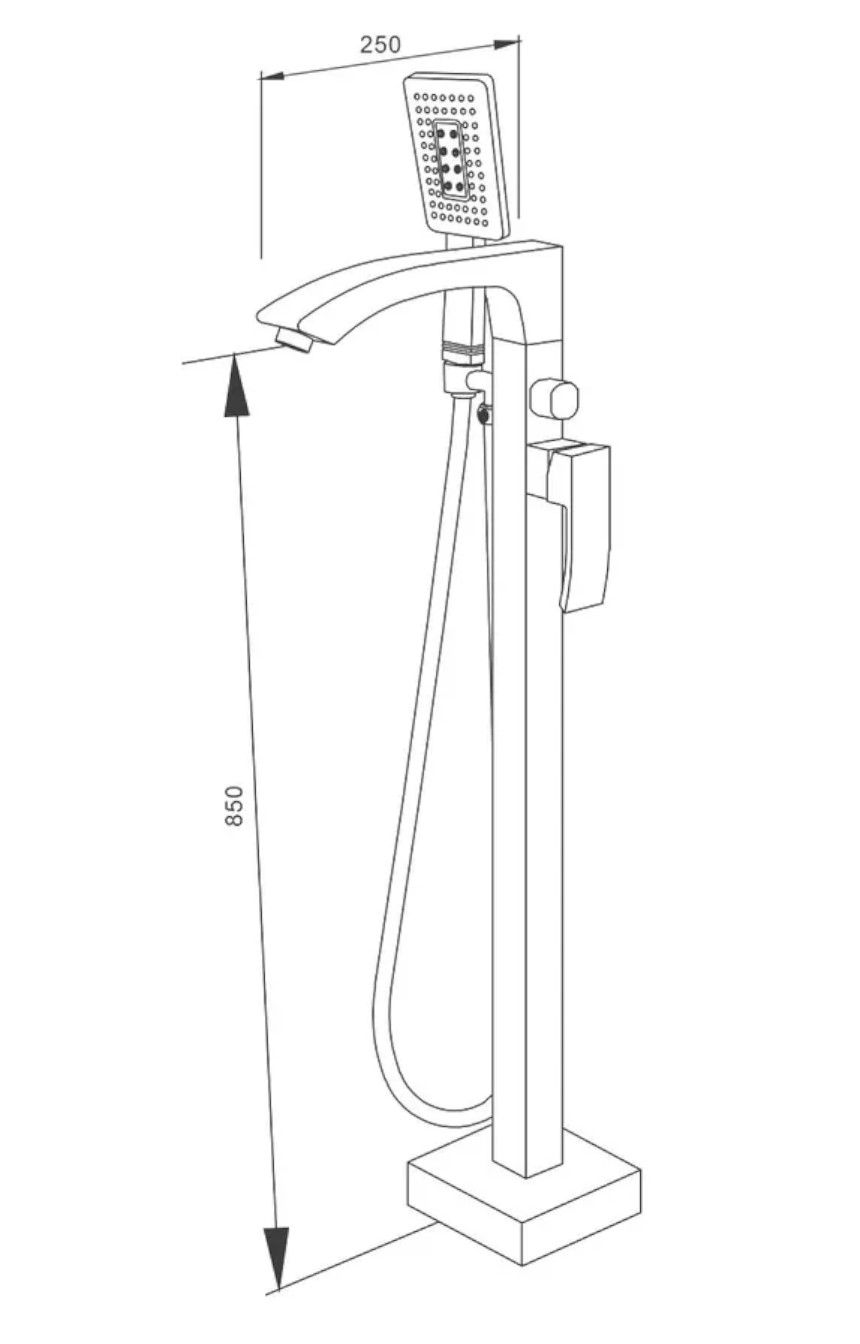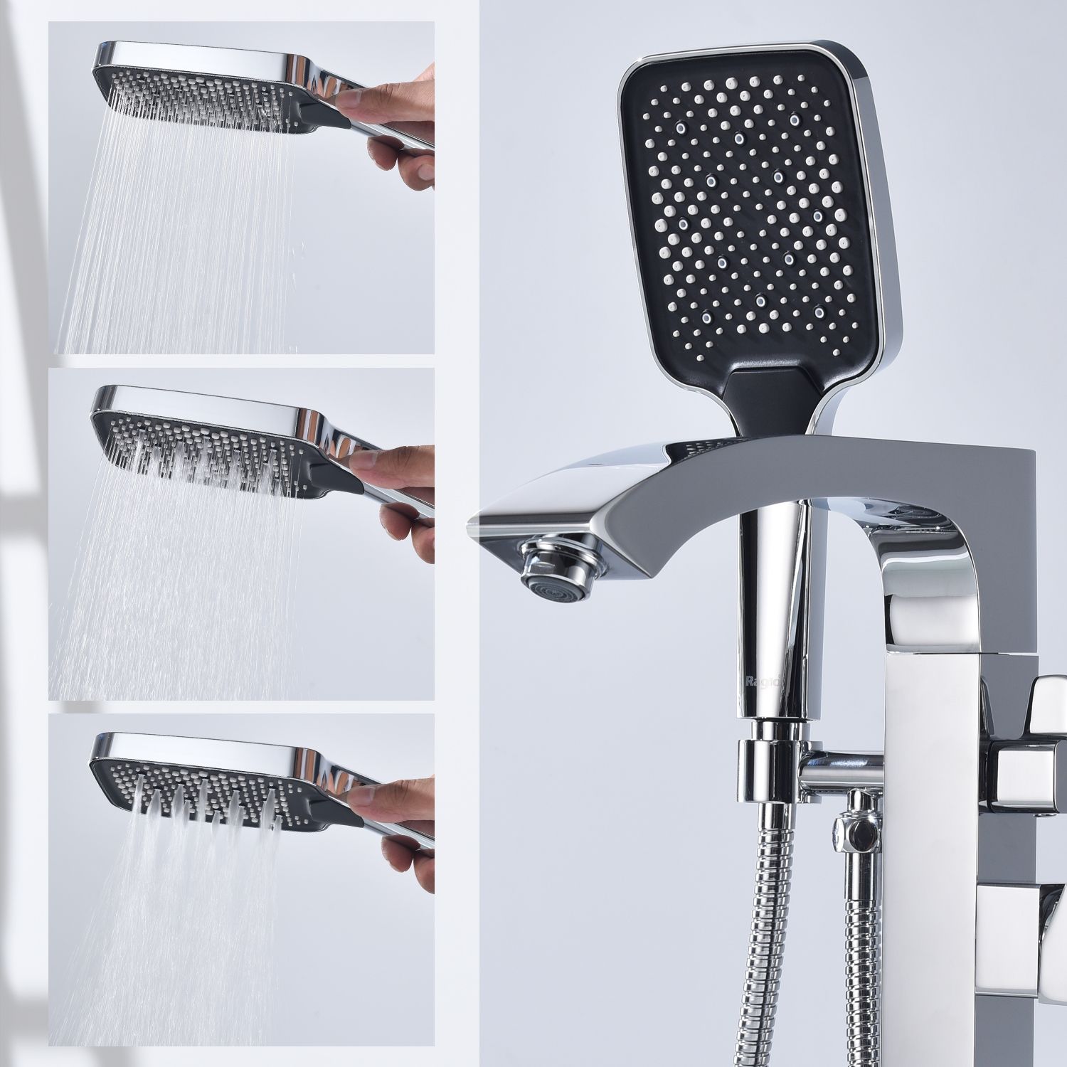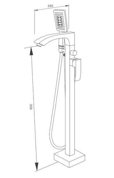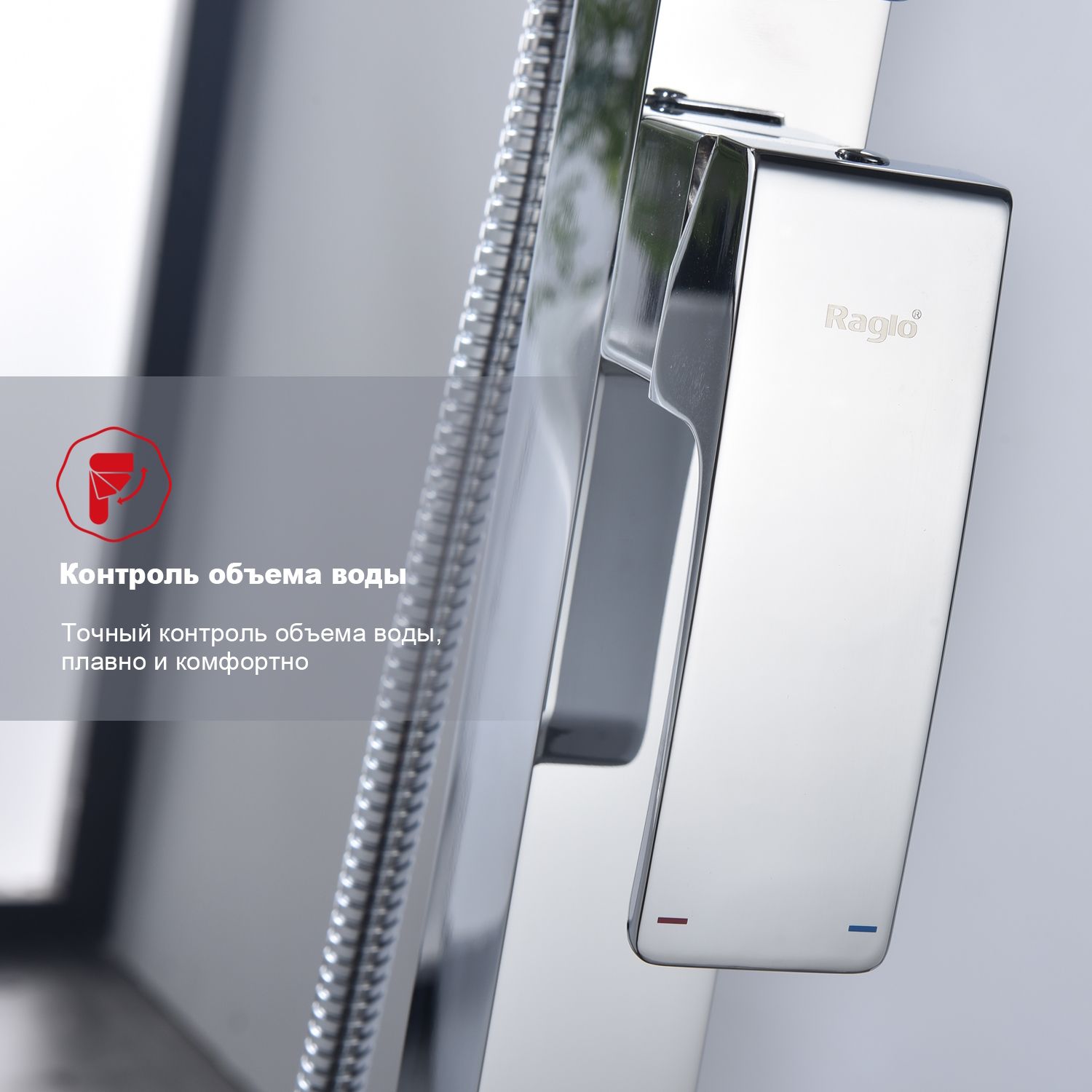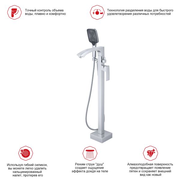 Смеситель для ванны напольный Raglo R01.33, хром. Однорычажный хромированный квадратный смеситель со стационарным средним изливом и высоким формированием струи. Современный стиль. Оснащен функцией экономии воды; аэратор. Изготовлен из прочного и надежного латунного материала.Напольный монтаж. Рычаг расположен сбоку. Переключение на душ осуществляется нажатием. Без системы быстрого монтажа.