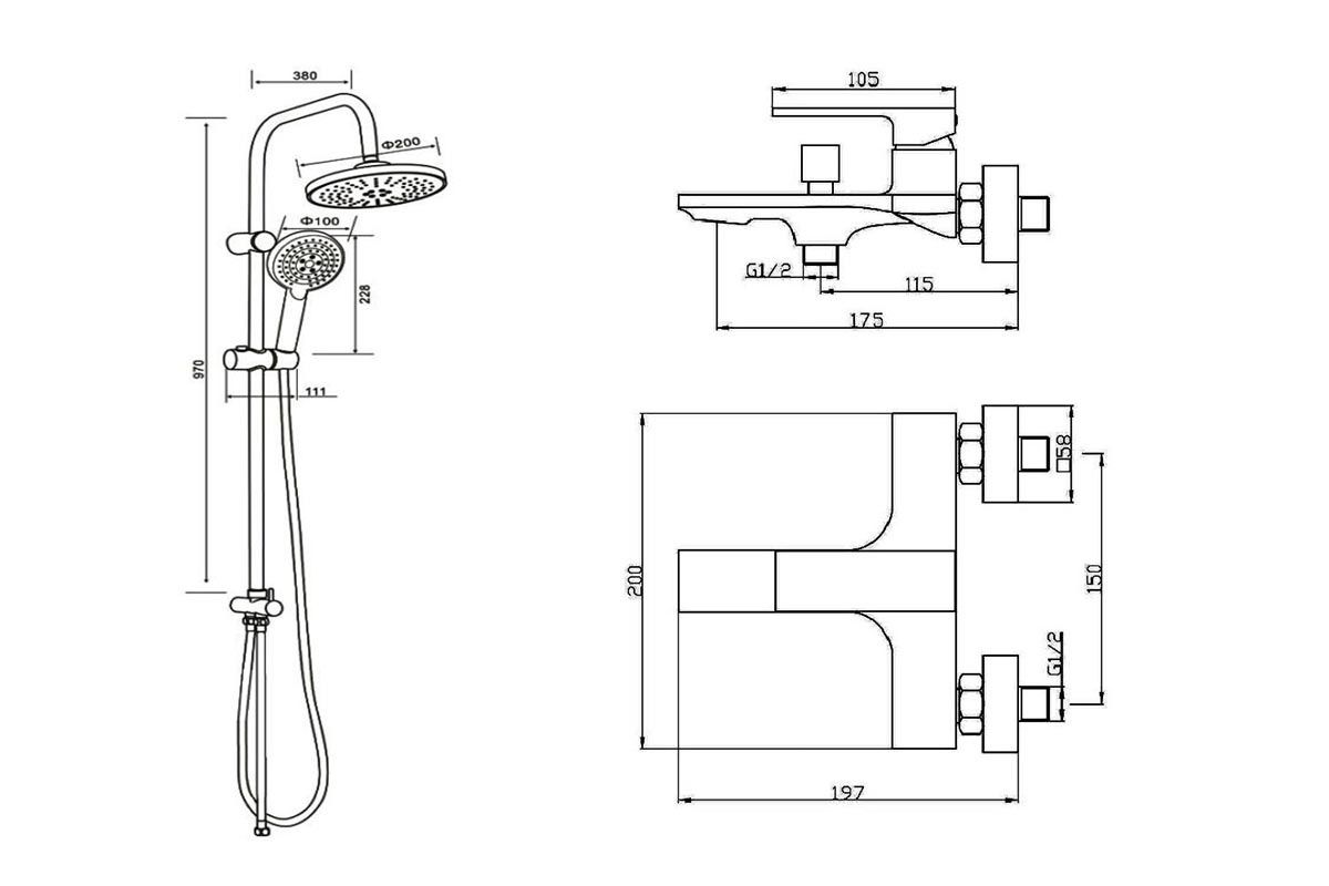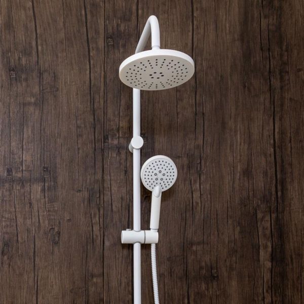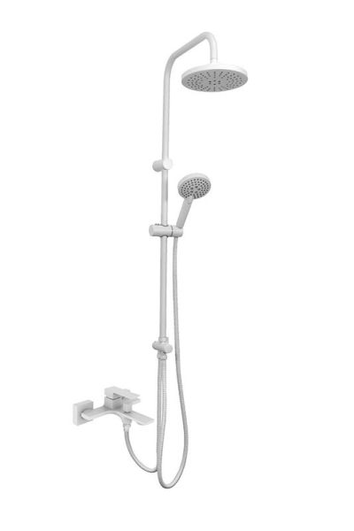 Душевая система с смесителем для ванны/душа в цвете белый глянец: верхний душ (d200 мм) создаёт эффект тропического дождя, что дарит непередаваемые эмоции во время ежедневных банных процедур. Ручной душ 100 мм (3 режима) на гибком полутораметровом шланге (в металлической оплетке) с защитой от перекручивания. Держатели верхнего и ручного душа с регулировкой угла наклона, штанга 970 мм. Подвижные детали отличаются долговечностью. Фиксируется душевая система непосредственно на стене, что позволяет рационально использовать ограниченное пространство ванной комнаты.