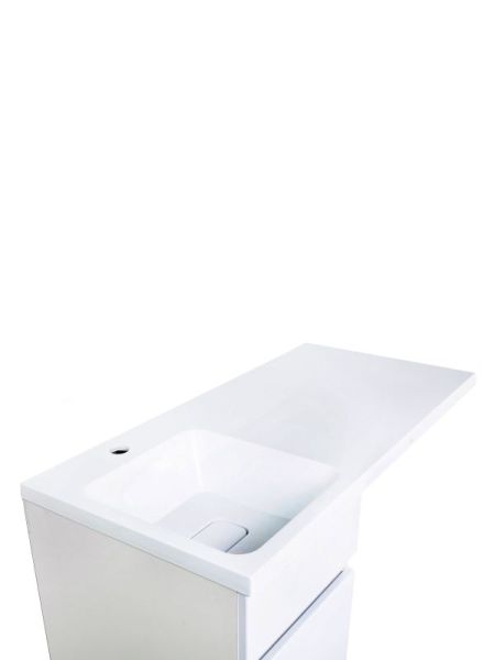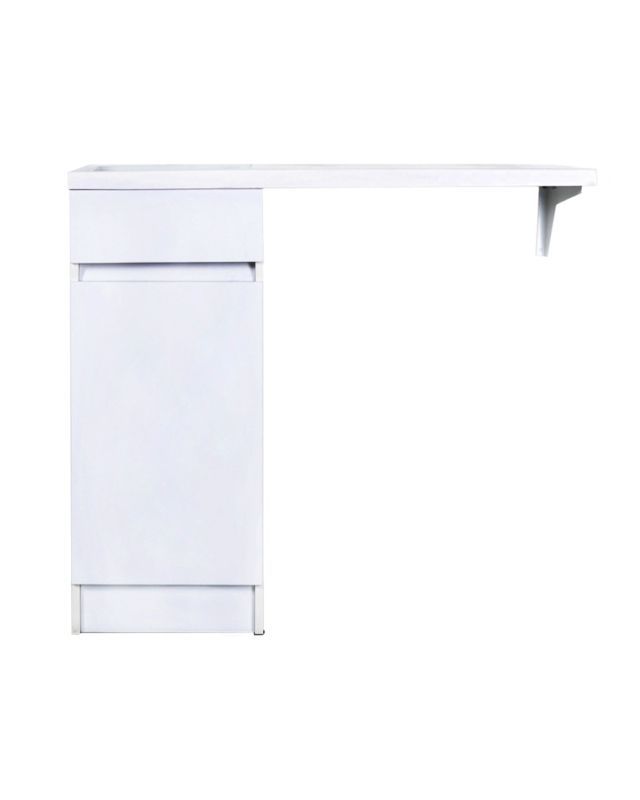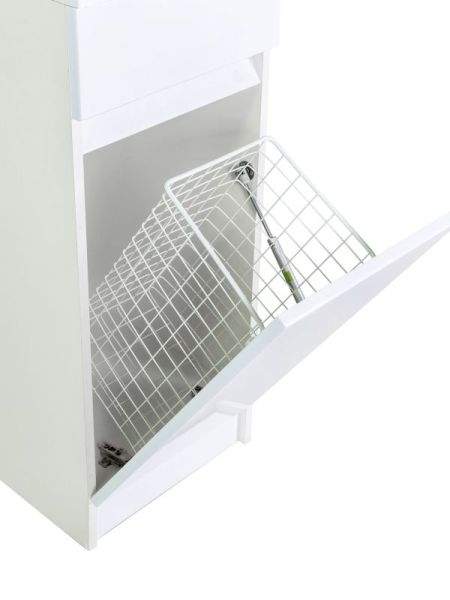 Тумба с раковиной под стиральную машину Orange Optima, левая, белый, с корзиной для белья, STK-40TUW+RALOrange OPTIMA STK-40TUW+RAL Тумба напольная с левой раковиной под стиральную машину c корзиной для белья. Предназначена для использования в ванных комнатах с повышенной влажностью. Откидная дверца с корзиной для белья оснащена механизмом плавного открывания. Фасад - МДФ в цвете белый глянец, покрытие пленка ПВХ. Корпус - ЛДСП в цвете белый глянец. Раковина с одним отверстием под смеситель (материал - искусственный камень).В комплекте ножки подпятники 4 шт (регулировка по высоте до 10 мм) и кронштейн для крепления крыла раковины.