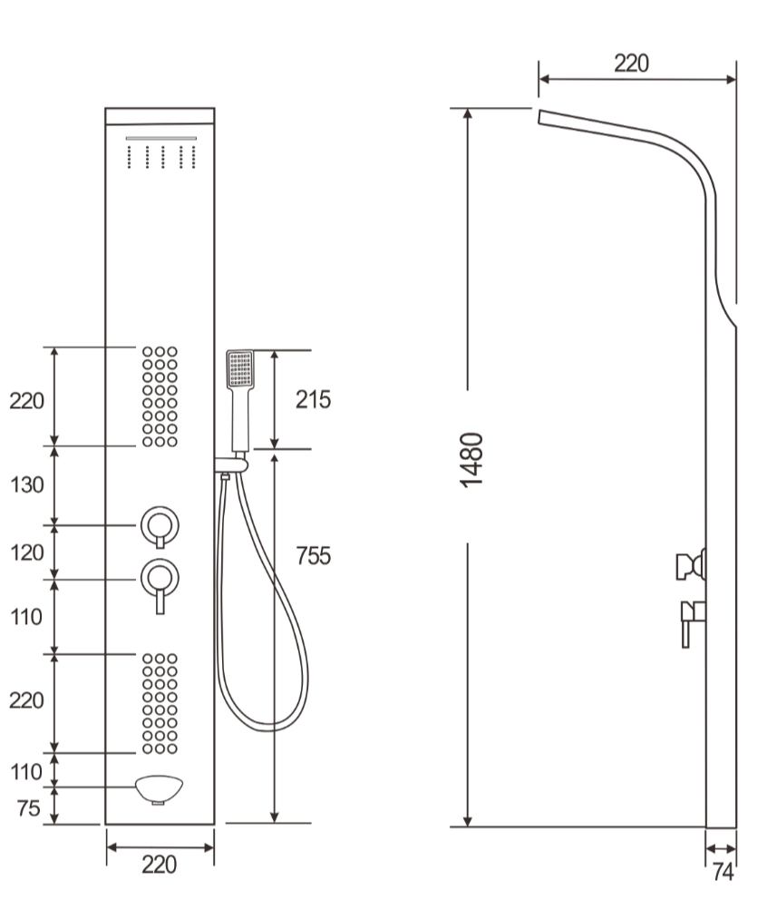 Комплектация: душевая панель, душевая лейка, смеситель, шланг для душа, верхний душ, крепеж, инструкция