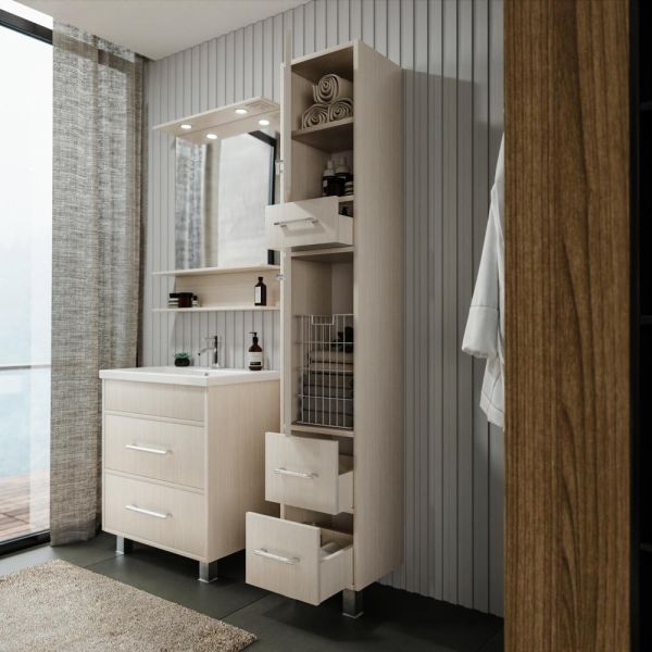 Основное преимущество шкаф-пенала заключается в его вместительности. Удобные полки и ящики позволяют организовать пространство и разместить все необходимое: от косметики до бытовых принадлежностей. Каждая деталь продумана для удобства использования, что делает утренние и вечерние ритуалы более приятными.
