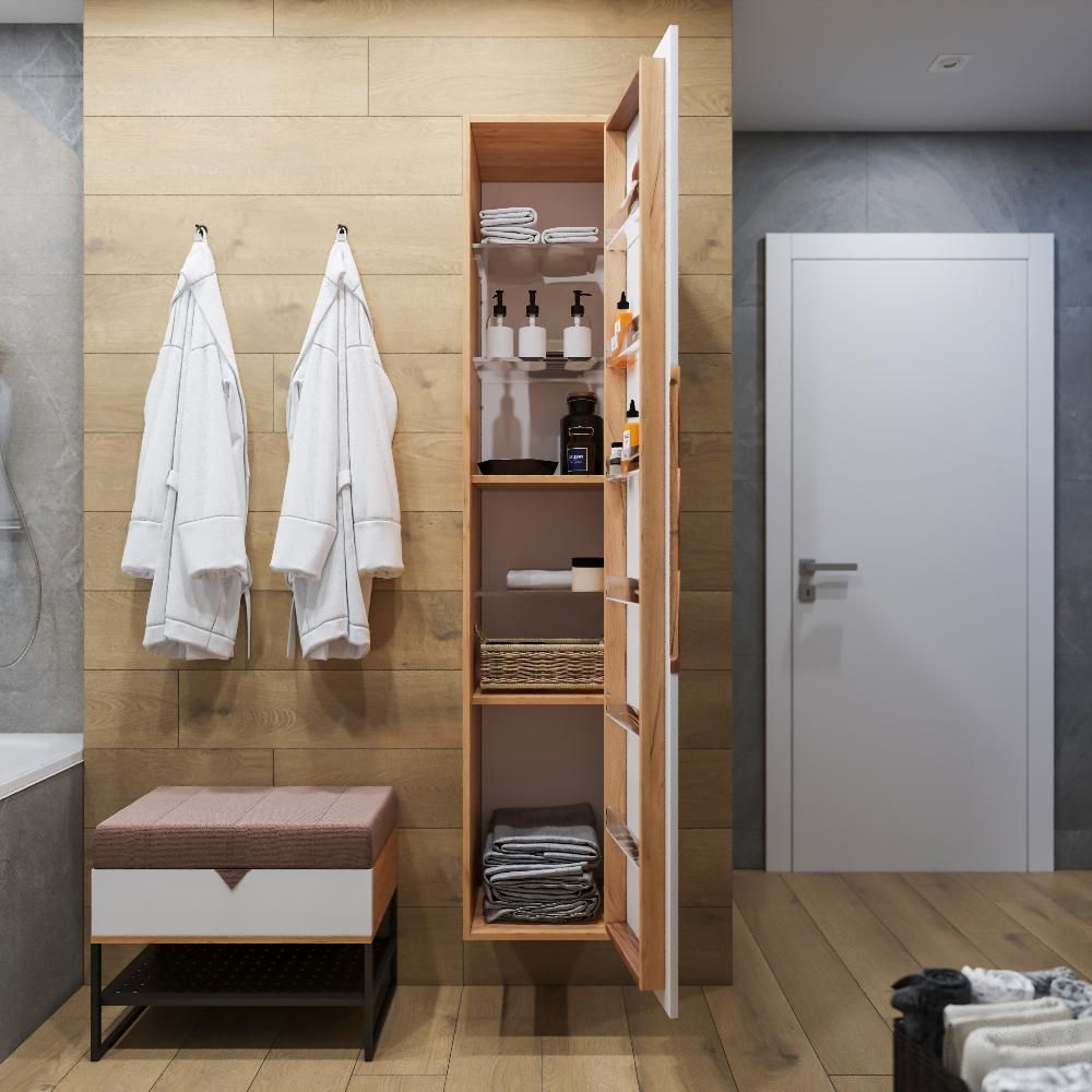 Шкаф-пенал для ванной комнаты – это стильное решение, которое гармонично вписывается в современный интерьер. Его элегантные линии и аккуратные формы создают атмосферу чистоты и порядка, что особенно важно в таком интимном пространстве. Изготовленный из качественных влагостойких материалов, этот шкаф обеспечивает долговечность и надежность, даже в условиях повышенной влажности.