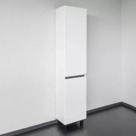 Габариты (ШхВхГ): 400*1900*300 ммНапольная шкаф-колонна отличное решение для хранения разных предметов необходимых в ванной комнате. За верхней дверцей три полки, за нижней одна. Фасады изготовлены из МДФ и окрашены белой глянцевой эмалью. Дверцы могут быть подвешены как в правом, там и в левом исполнении. Петли оборудованы механизмами плавного закрывания.