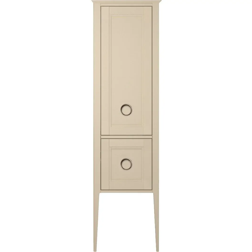 Высокий напольный пенал из массива ясеня с эффектом открытой поры, с распашной дверцей и выдвижным ящиком. Фасад украшен классической фурнитурой. Пространство за дверцей разделено несколькими регулируемыми полками. Петли для крепления дверцы расположены справа.