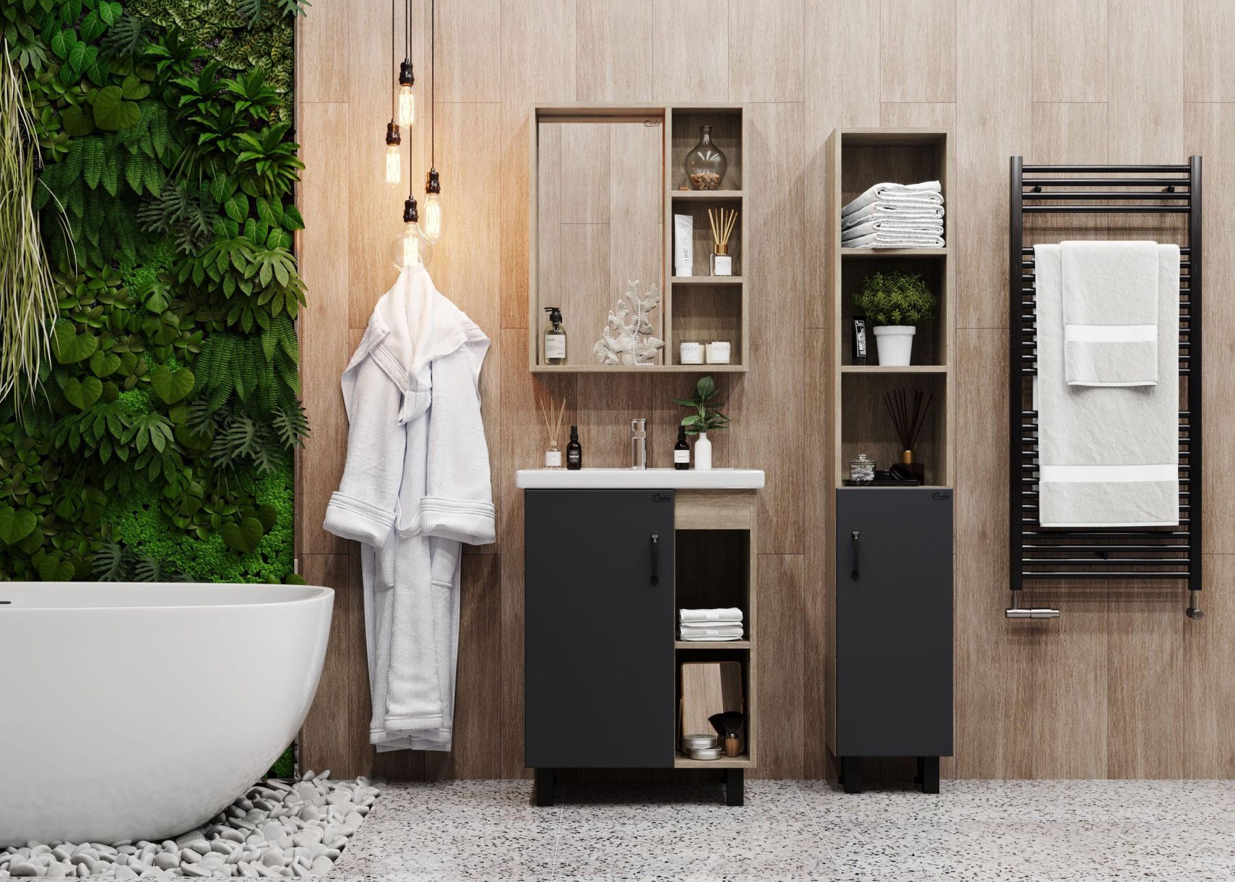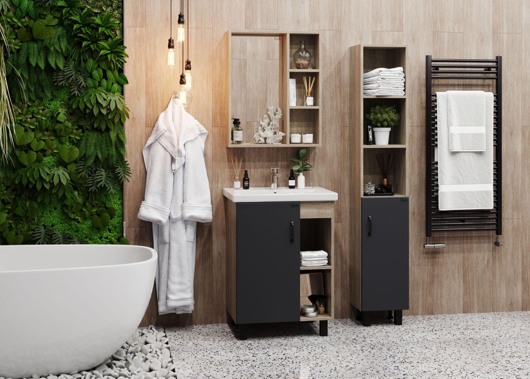 Напольный пенал для ванной комнаты пенал Onika ТИМБЕР 30 удачно сочетаются контрастные цвета и фактуры: серый матовый фасад с покрытием SoftTouch, корпус цвета дуб сонома с роскошной текстурой, черная матовая металлическая фурнитура.