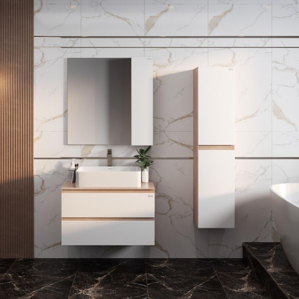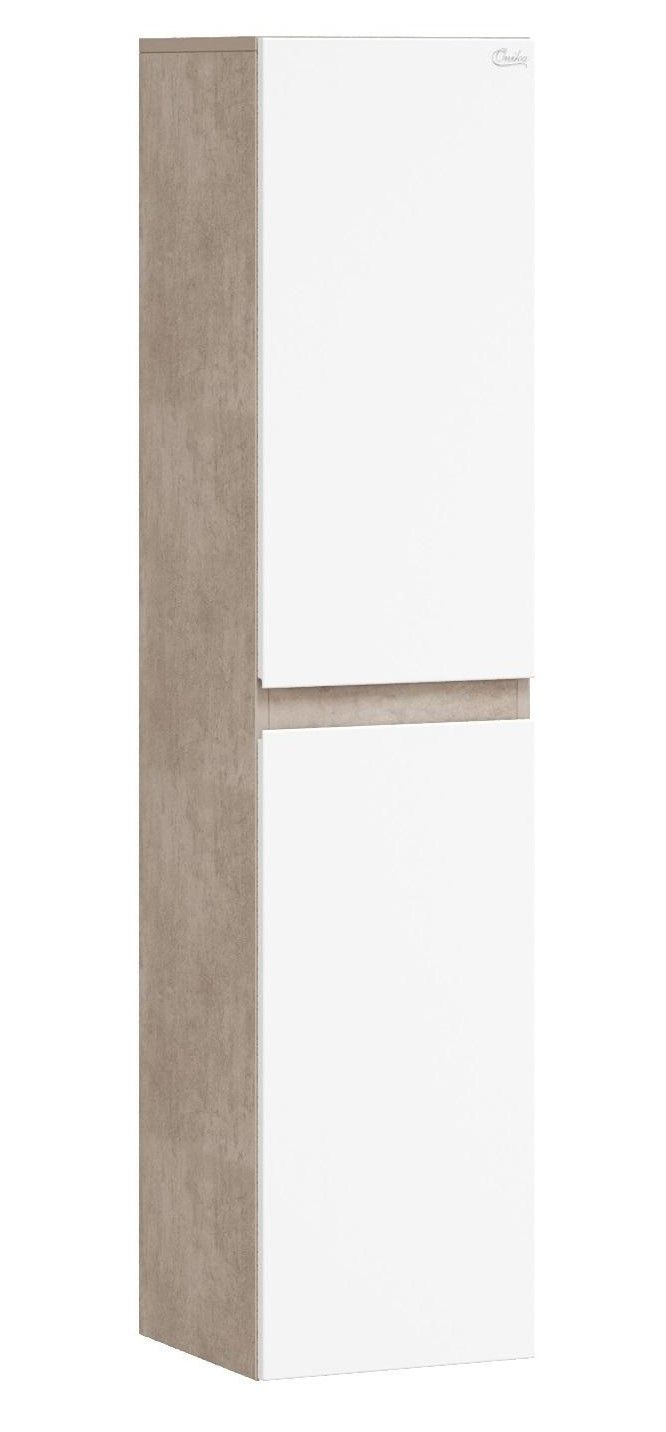 Подвесной шкаф пенал для ванной комнаты пенал Onika АЛЕСТА 35 отражает актуальные тенденции в дизайне мебели для ванной комнаты: минимализм и геометрия фасадов, белый глянец и текстура бетонного камня, отсутствие декора, скрытая встроенная ручка.