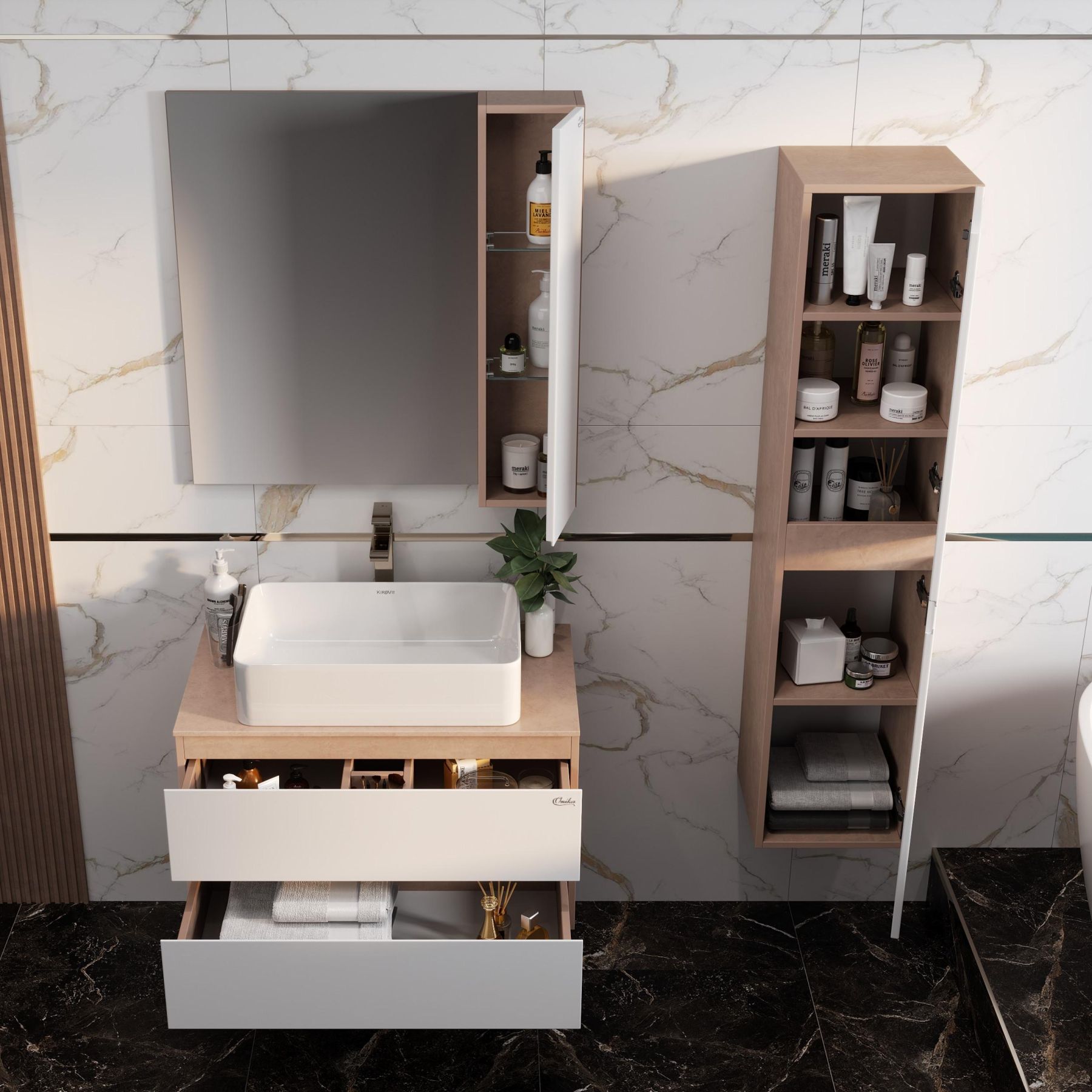 Внутреннее пространство пенала поделено полками на 5 секций разной высоты, что позволяет удобно разместить все необходимые мелочи. Двери снабжены механизмом плавного закрывания. Ручки, изящно интегрированные в фасады, позволяют сделать эксплуатацию мебели более удобной и практичной.
