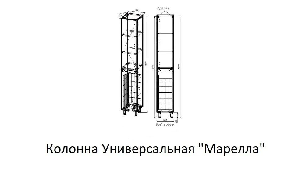 - 1 распашной фасад, 2 полки, бельевая корзина