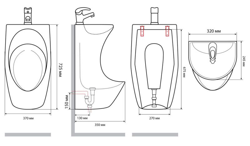 Компактные размеры: ширина писсуара составляет 37 см, глубина - 35 см, а высота - 72.5 см. Раковина имеет размеры 32х24,5 см, что позволяет экономить пространство в санузле.