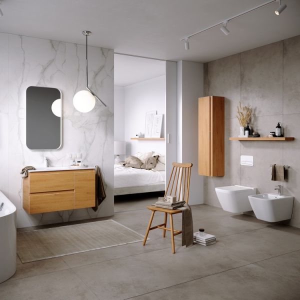 Подвесная тумба под раковину Aqwella Accent ACC0109LDZ 90 смПодвесная тумба с двумя ящиками и одной дверью в цвете дуб золотой с умывальником из литьевого мрамора (чаша слева)