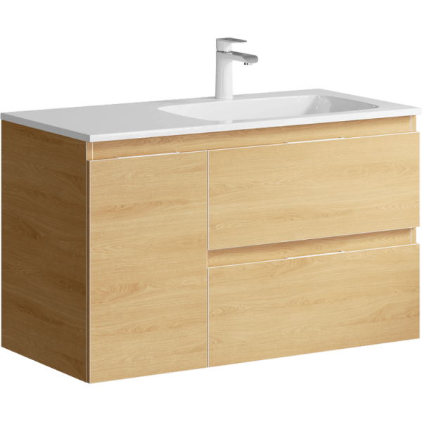 Подвесная тумба под раковину Aqwella Accent ACC0109RDZ 90 смПодвесная тумба с двумя ящиками и одной дверью в цвете дуб золотой с умывальником из литьевого мрамора (чаша справа)