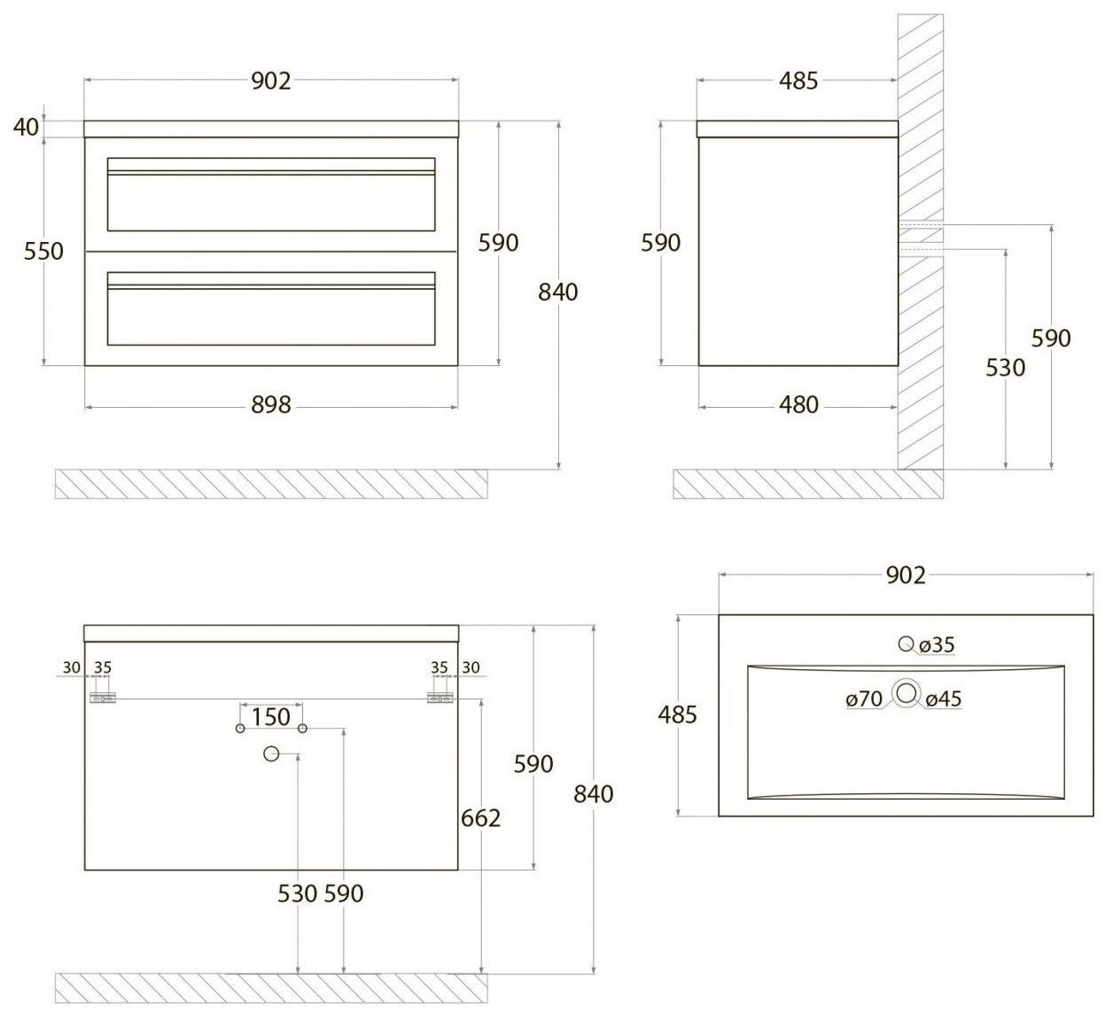 - Рекомендуемая высота от пола: 844 мм