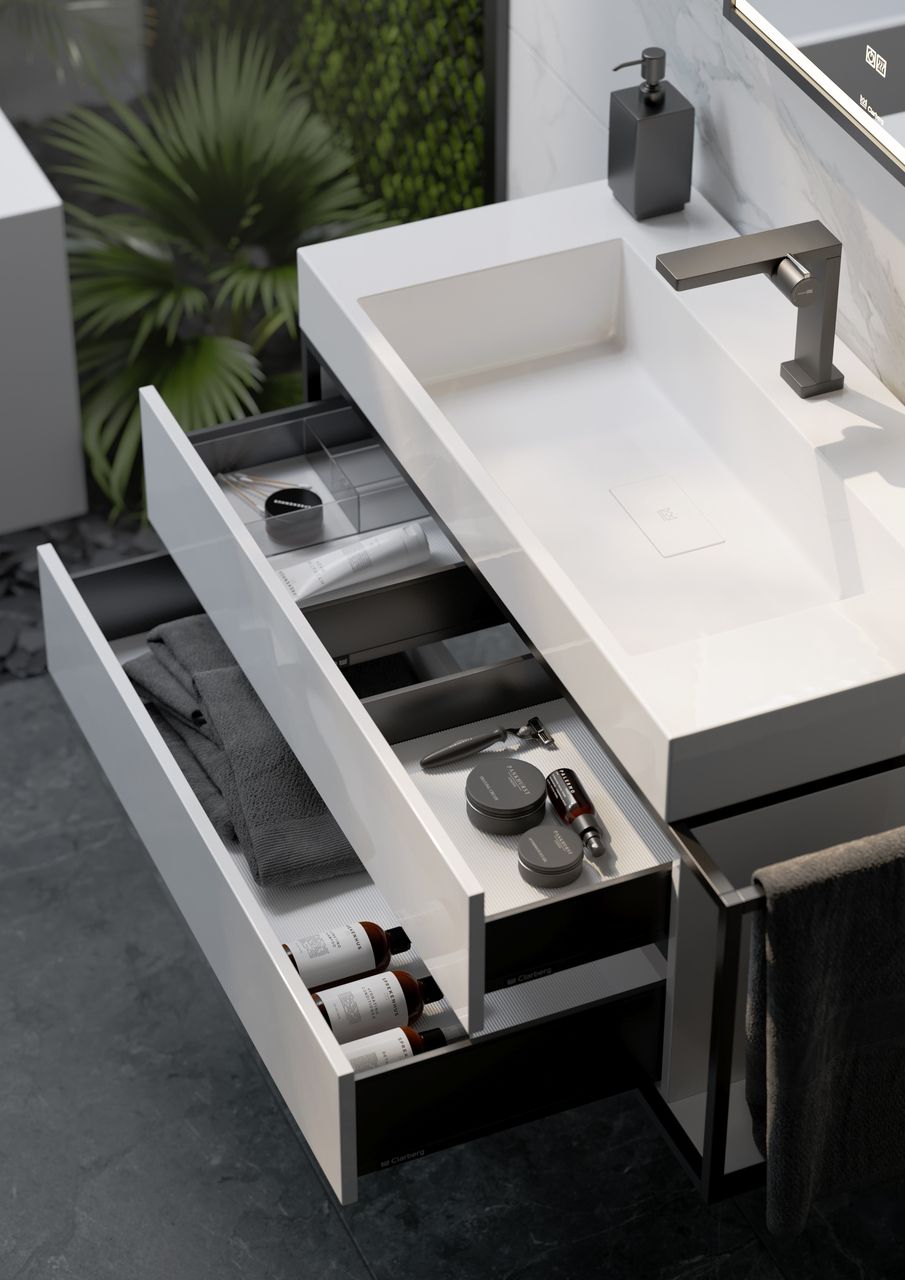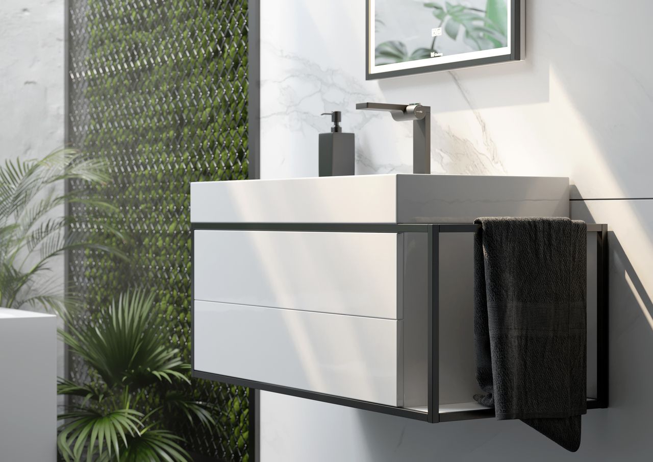 Подвесная тумба под раковину Clarberg Logic 80 L LOG0108L с двумя ящиками и дополнительной консолью для полотенец справа. Главная особенность коллекции - это применение алюминиевого анодированного профиля в чёрном цвете.Технические данные:Цвет: белый.