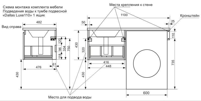 Коллекция мебели для ванной комнаты Dallas Luxe покоряет своей удивительной простой и функциональностью. Современная тумба укомплектована раковиной из литьевого мрамора с удобной чашей. Стиральная машина устанавливается под столешницей, за счет чего экономит место в ванной комнате. В тумбе имеются два ящика. Нижний ящик тумбы – широкий и вместительный – предназначен для крупных предметов, а в верхнем имеется специальная организация пространства, позволяющая хранить мелкие вещи. Подвесная система монтажа позволяет более эффективно использовать пространство, не мешает уборке в ванной комнате.
