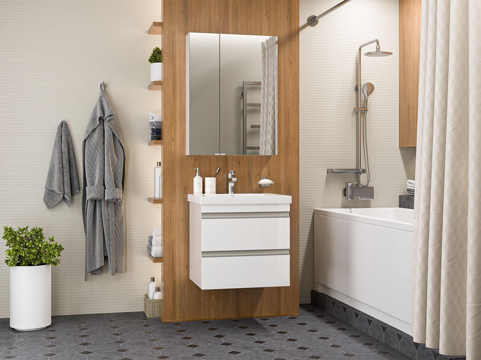 Подвесная тумба в ванную комнату – это не просто элемент мебели, а подлинный акцент в интерьере, который сочетает в себе функциональность и стиль. Она придаёт помещению лёгкость и воздушность, освобождая пространство на полу и создавая иллюзию большего объёма.Функциональные особенности таких тумб варьируются от наличия выдвижных ящиков до встроенных систем хранения, которые помогают организовать пространство ванной комнаты. Важным аспектом является также возможность выбора различных цветовых решений и отделок, что позволяет гармонично вписать тумбу в любой интерьер – от классического до ультрасовременного.С помощью подвесной тумбы ванная комната становится не только более удобной, но и эстетически привлекательной, создавая атмосферу уюта и роскоши.